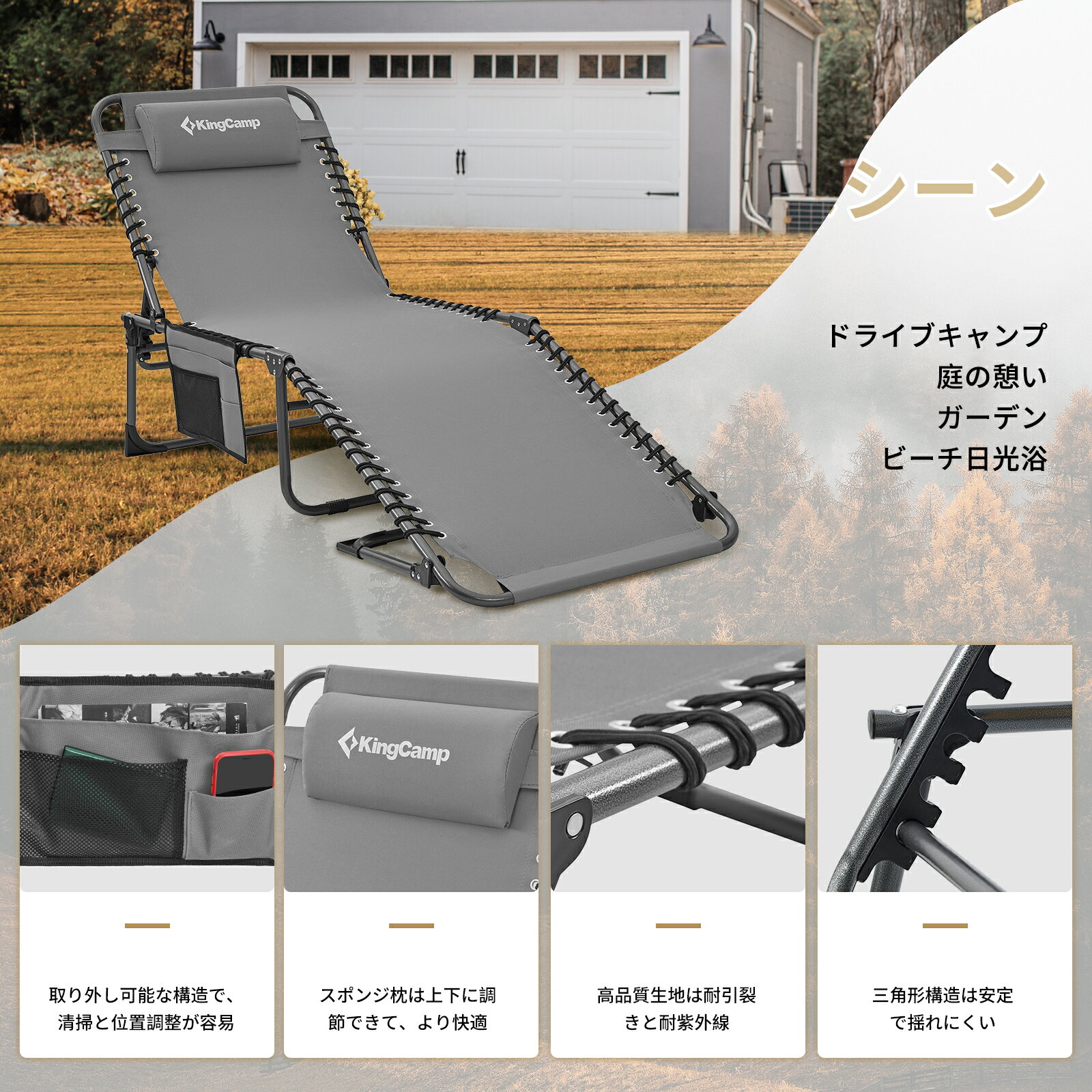 商品名折りたたみ サマーベッド 5段階調節 1台3役 コット商品番号KC2419ブランド名KingCamp素材/材質フレーム:スチール合金 生地:600Dオックスフォードカラーグレー、ベージュ展開サイズ 収納サイズ約190×59×34/37cm 約76x15x60cm本体重量 耐荷重約6.4kg 約120KG特徴組み立不要、コットを簡単に広げ、60秒で設置できます。生産地中国注意事項・商品の撮影には最大限注意を払っておりますが、閲覧時のモニター環境によりましては実際の商品と若干違うお色味に映ることもございます。 ・こちらの商品は実店舗でも販売しております関係上、ご購入のタイミングによっては品切れが発生する場合もございます。大変恐れ入りますが、その場合はキャンセル対応をさせていただきますこと、予めご了承ください。 ・当店の商品は全て国内から配送されます。 ・国内配送の商品は国内でのお買い物と同じく消費税が発生いたします。関税はかかりません。おすすめポイントアウトドア 軽量 折りたたみ コンパクト リクライニング アウトドア用品 お家キャンプ おしゃれ キャンプ 持ち運び 父の日 プレゼント 母の日 お中元 おすすめ 1台3役 サマーベッド ビーチベッド キャンプ ベッド コット ベンチ デッキチェア 4段階調節 190×59×37cm 耐荷重140kg 折りたたみ リクライニングベッド 簡易ベッド 折りたたみベッド 仮眠 アウトドア 日光浴 枕付き 送料無料 KingCamp 敬老の日【耐久性と安定性】高密度防撕裂オックスフォード生地を使用し、耐久性が高く、長時間の使用にも耐えます。ベッドフレームは強固なスチールで作られ、高い安定感を提供します。人間工学に基づいたS字デザインで体にフィットし、快適な寝心地を実現します。さらに、防滑フットカバーが付いており、野外でも揺れることなく、快適かつ安定した休息を楽しむことができます。 【5段階調節】背もたれは5段階の角度調節(120°/140°/155°/170°/180°)が可能で、サマーベッド/ベンチ/ビーチチェアに変換でき、自由な角度調整で様々なシーンに対応します。取り外し可能な枕付きで、弾性バンドで固定することで、頭部をしっかりとサポートし、体圧を均一に分散させて、快適な座り心地を実現します。 【サイズ・組立不要】展開サイズ:190×59×34cm;収納サイズ:78×14×60 cm;重量:6.4kg、静圧荷重120kg、衝撃荷重140kg。60秒で簡単に展開/収納できるので、面倒な組み立て作業は不要です。迅速にアウトドア冒険を楽しむことができます! 【便利なデザインと携帯性】お客様のニーズを考慮し、ベッドにはサイドポケットを設計して、雑誌や水筒などの日常品を収納できるようにしました。取り外し可能な構造で、掃除や調整が簡単に行えます。サイドには肩ひもと手提げひもの二重携帯設計を採用し、持ち運びが便利で、カシメ設計で散開を防ぎます。 【多機能な用途】キャンプ、庭のガーデン、日光浴、ビーチ、釣り、花見など、自然を満喫するために使用できます。また、災害時や車中泊時にも便利なベッドとして利用できます。室内での仮眠、事務室の昼寝、仕事場での寝泊まり、夏の暑さをしのぐための休憩や、病院での付き添いにも最適です。車中泊や緊急避難時など、幅広いシーンで活用できます。実際の色は写真をご覧ください。 【品質保証】弊社出荷の商品は1年間の安心保証付きで、万一商品に問題があれば、いつでもお気軽にご連絡ください。心をこめて対応いたします。 【注意事項】水に濡らしたり、直射日光の下に長時間置かないでください。