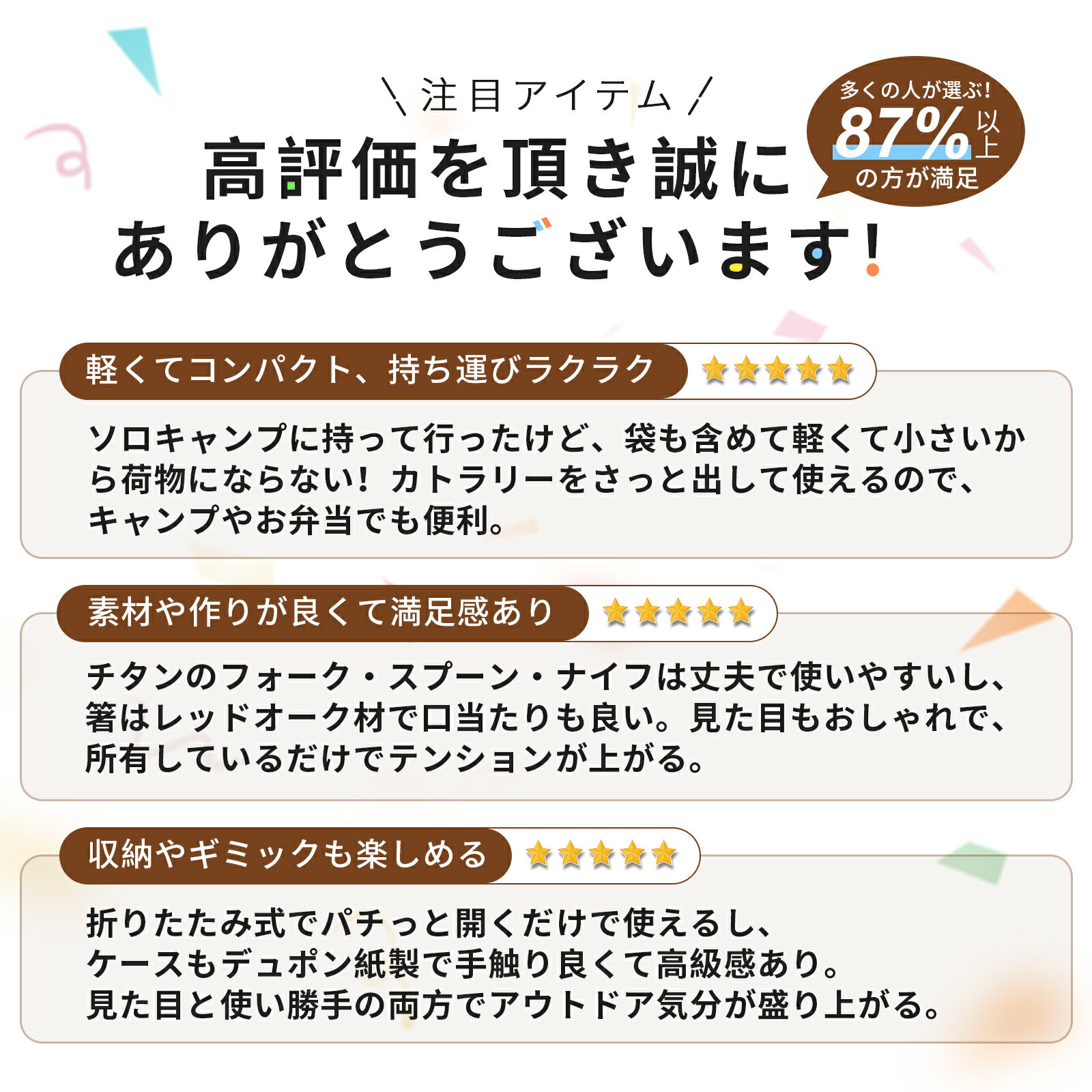 商品名折りたたみ式カトラリーセット・5pcs素材カトラリー:チタン(TA1グレード・純度99.9%)+ステンレス(折りたたみ機構部分) 箸:レッドオーク(天然木) 収納袋:デュポン紙収納時サイズL120×W60×H35mm重量約90gセット内容折りたたみ式チタンカトラリー(ナイフ・フォーク・スプーン)×各1 レッドオーク製箸×1膳 デュポン紙収納袋×1特徴・高品質チタン製カトラリー:航空機グレードのチタン素材を採用。ステンレス製に比べ約30%軽量、錆びにくく耐久性抜群。 ・折りたたみ式&超コンパクト:収納全パーツ折りたたみ可能。付属の耐水・耐久デュポン紙製収納袋にすっきり収納。持ち運びに便利。 ・天然木レッドオーク製箸:熱伝導率が低く、持ったときに熱くならず、手にも優しい自然素材。 ・食品衛生検査・国際認証取得:日本の食品衛生法に適合、ドイツLFGB・米国FDA認証取得済み。安心して使用可能。おすすめポイント・荷物を軽くしたいアウトドア派に:ナイフ・スプーン・フォーク・箸がわずか90g。バッグの重量を抑えたい方に最適。 ・旅行や登山で「ちゃんとした食器」を使いたい方に:軽量かつ丈夫、長期間使用できるので、頻繁なアウトドアや旅先でも大活躍。 ・環境に優しいアイテムを探している方に:収納袋は環境配慮型のデュポン紙を使用。エコな選択を応援します。 ・アウトドアでも「自宅のような食事時間」を楽しみたい方に:手に優しいレッドオーク箸と使いやすいカトラリーで、自然の中でも快適な食事を。お手入れ※天然素材を使用しているため、木製箸の色合いや木目には個体差があります。 ※シェラカップは直火対応ですが、長時間の空焚きはお控えください。 ※洗浄後はしっかり乾燥させてから収納してください。「お湯を沸かしてほっと一息」<今すぐチェック!>アウトドアを変えるチタン薪ストーブ特集これ一台で、焚き火・調理・暖房すべてを。同ブランドのチタン角型クッカーセット(1100mlポット+300mlフライパン+400mlケトル)にすっきり収納可能。「食べる・調理する・飲む」がこれ一式で完結 キャンプギアを効率的にまとめたい方に、セットでの購入をおすすめします。「他の人気カテゴリはこちら」