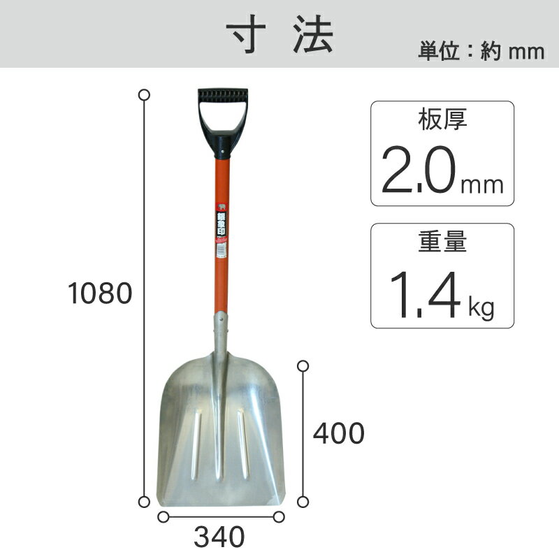 商品用途・特長 ・除雪作業、農作業、畜産関係など、たくさんすくう作業に適しています。 ・銀象D柄アルミスコップ#3(先幅295mm)より45mm幅を広くすることで、一度にたくさんすくうことができます。 ・頭部(すくい部)はアルミ合金で軽量です。 修理対応品 柄交換修理対応商品。 詳細はアフター修理のご案内をご参照ください。 商品情報 サイズ 全長:1080mm 頭部先幅:340mm 頭部長さ:400mm 頭部板厚:2.0mm 重量 1.4kg 材質 頭部:アルミニウム合金 柄部:天然木 グリップ部:ポリエチレン 製造国 日本 JANコード 4960517003467 *季節商品の為、「在庫あり表示」の商品につきましても、シーズン中に品切れとなる場合がございますので予めご了承ください。 *ご注文が集中し、発送が大幅に遅れる場合がございますので予めご了承ください。