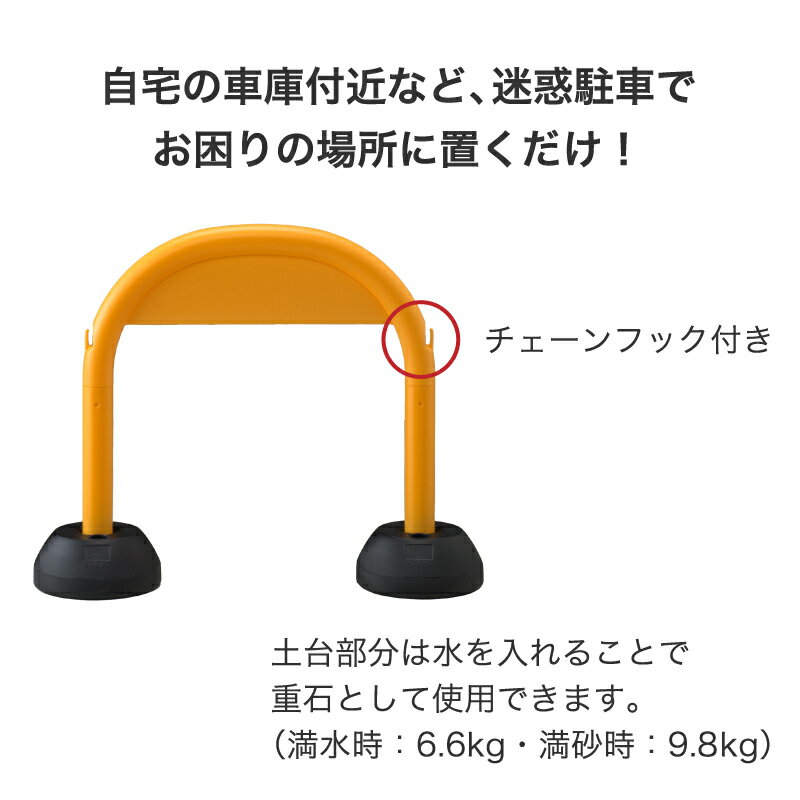 かわいいフォルムの車止め。 商品特徴 ・土台部分は水を入れることで重石として使用できます。 ・チェーンをひっかけられるフック付。 ・迷惑駐車対策。 ・材質はPE。 関連商品 ・アーチスタンド イエロー 1個 ・プラチェーン 6mm 3mカット イエロー 商品情報 サイズ W900×D255×H725mm、3個入り 重量 アーチスタンド1個=1.4kg、プラチェーン2.5m(約160g×2本) 材質 PE カラー イエロー 製造国 日本 納期の目安 受注後3日前後で出荷 ご注意 ※返品不可商品 ※メーカー直送品のため、代金引換・後払い(コンビニ・郵便局・銀行)の決済方法をご利用いただけません。 ※時間帯指定および日曜・祝祭日の配達日指定もお受けすることができません。 ※北海道・沖縄・離島・その他郡部(中継必要となる地域)は別途送料が必要となります。 また、配達不可地域がございます。あらかじめご了承ください。