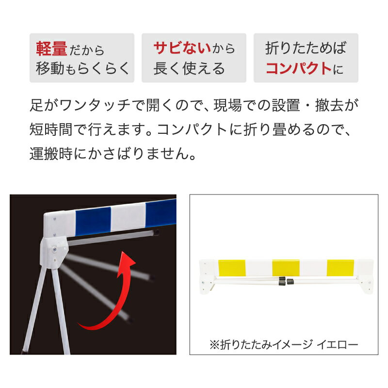 移動もラクラク。折りたたみ式プラスチックバリケード。 商品特徴 ・移動工事に。清掃点検、点検作業に。 ・足がワンタッチで開くので現場での設置、撤去が短時間で行えます。 ・コンパクトに折りたためるので、運搬時にかさばりません。 ・材質はABS、PE、PC、パイプ(スチール:PVC皮膜)、反射シート(PET)、スチール(ユニクロ、三価)。 商品情報 商品サイズ W1000×D97×H200mm(折りたたみ時) W1000×D350×H580mm(設置時) 本体1個入り 重量 1.5kg 材質 ABS、PE、PC、パイプ(スチール:PVC皮膜)、反射シート(PET)、スチール(ユニクロ、三価)。 カラー ブルー、ホワイト 製造国 日本 納期の目安 受注後5日前後で出荷 ご注意 ※返品不可商品 ※メーカー直送品のため、代金引換・後払い(コンビニ・郵便局・銀行)の決済方法をご利用いただけません。 ※時間帯指定および日曜・祝祭日の配達日指定もお受けすることができません。 ※北海道・沖縄・離島・その他郡部(中継必要となる地域)は別途送料が必要となります。 また、配達不可地域がございます。あらかじめご了承ください。