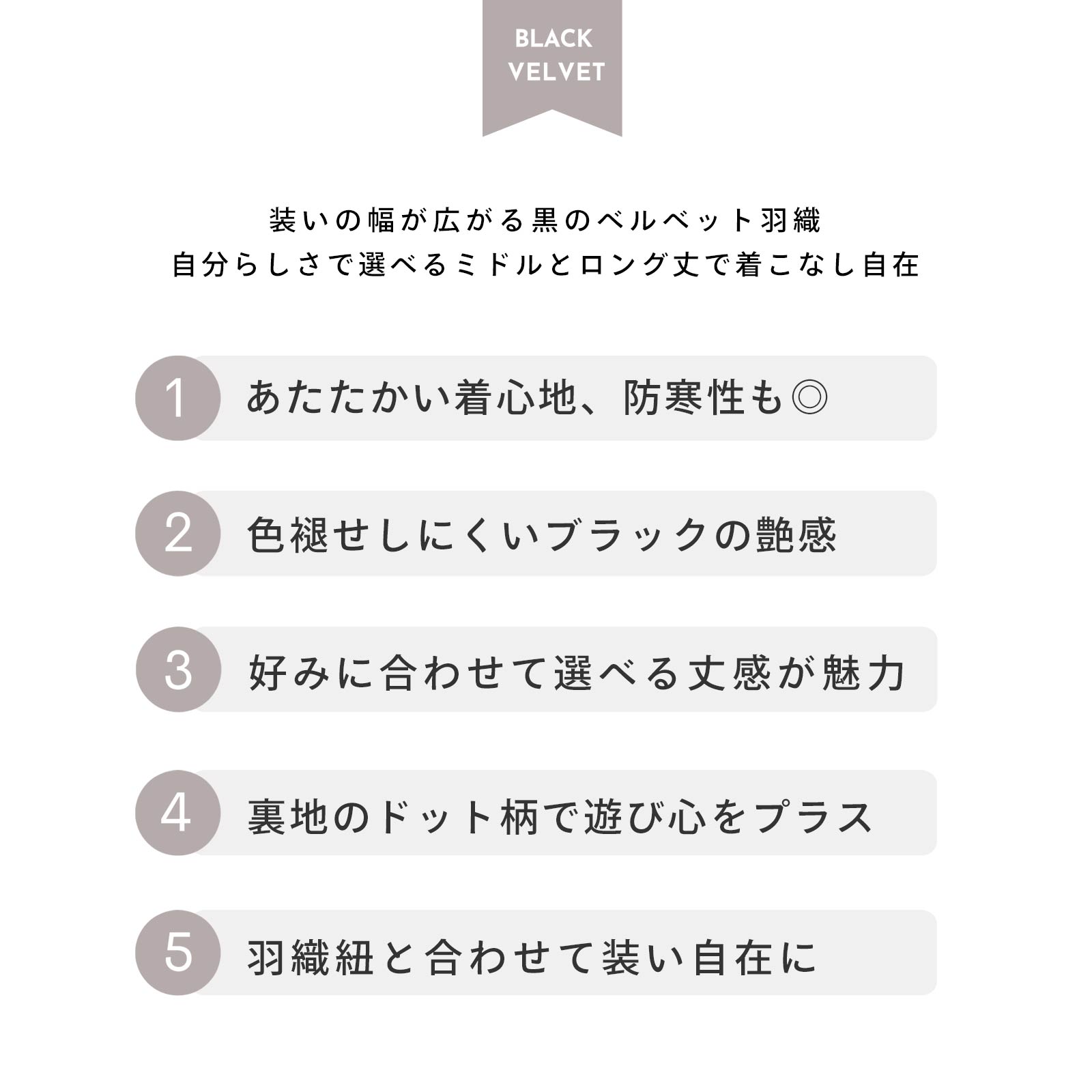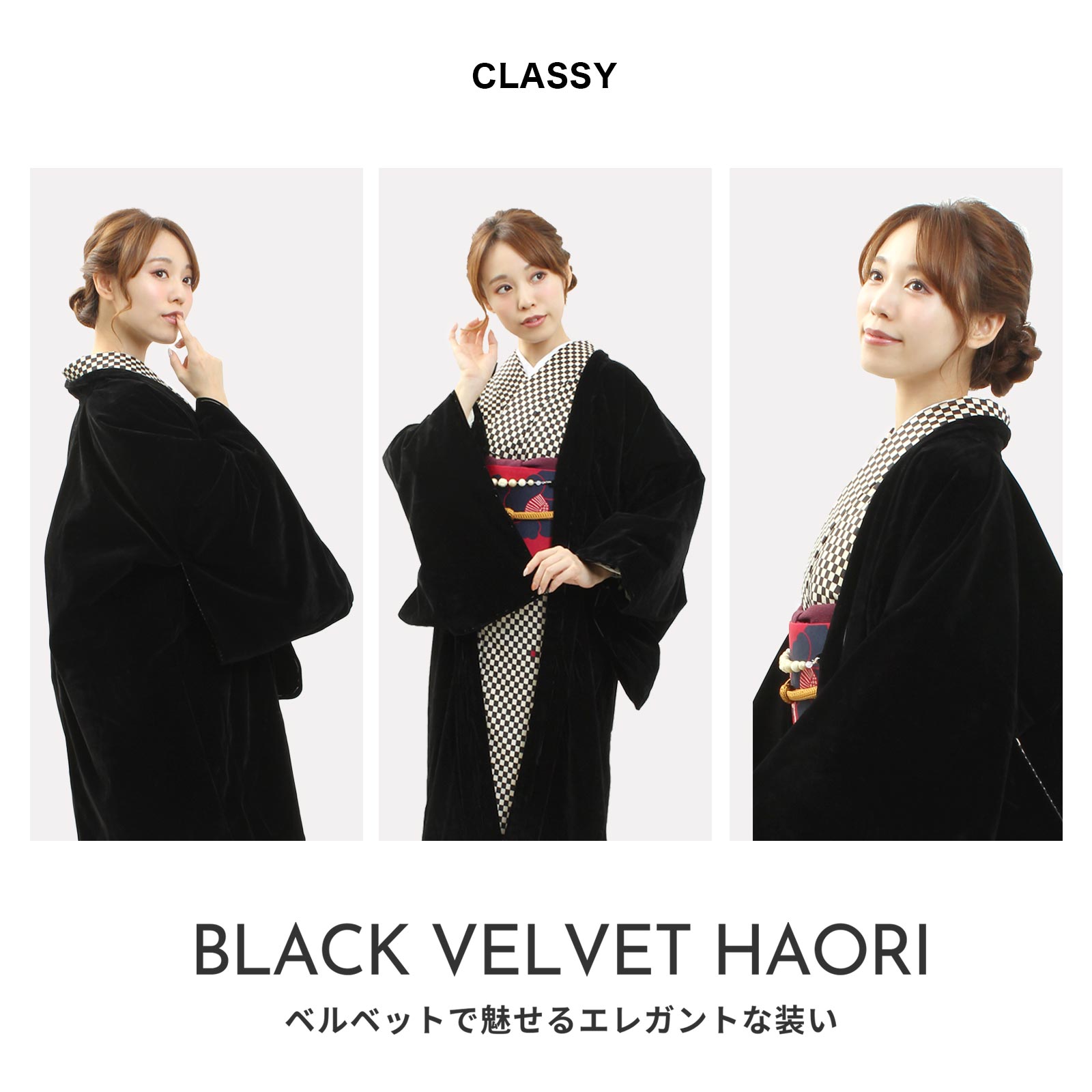 ベルベット羽織 レディース 長羽織 羽織 防寒 冬 ベルベット 黒 ブラック (ミドル丈/ロング丈) 着物 洗える着物 和装 はおり レトロ クラシカル モダン アウター 女性 婦人 暖かい 上着 旅行 お出かけ ファッション お洒落 温泉