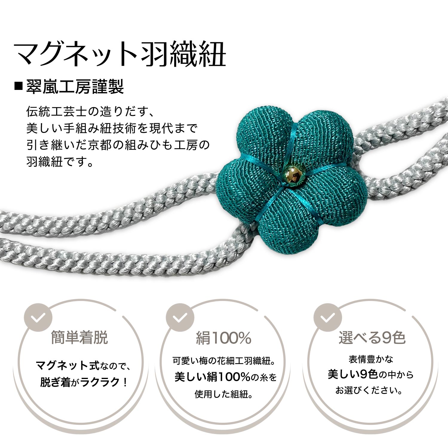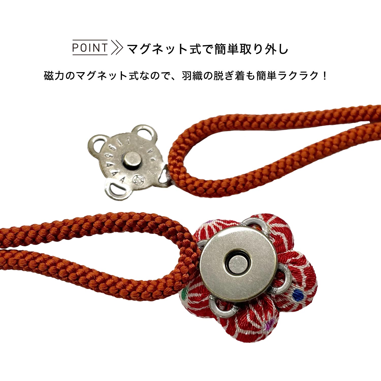 羽織紐 マグネット羽織紐 レディース 花生地 9色 麻の葉 無地 黒 赤 金茶 朱 灰 羽織 和装 着物 メール便 お取寄せ おしゃれ マグネット 日本製 女性用 羽織り紐 和装小物 カニ環 お稽古 お茶会 留袖 訪問着 お出かけ 記念 撮影 フォーマル 祝い事 入学式