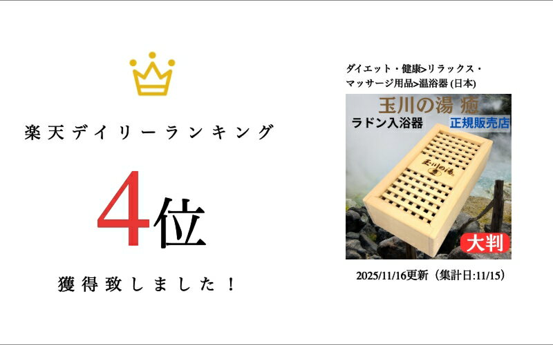 商品情報 商品の説明 玉川温泉での入浴に発想を得た、ラジウムとマイナスイオン、遠赤外線を発生する「玉川の湯 癒」。 玉川温泉の秘密は「北投石」にありますが、北投石は天然記念物の為、外部に持ち出せません。そこで、湯の花に着目した玉川ラドンシートユニットを採用。玉川温泉を目指した癒しを自宅のお風呂で楽しむことができます。「玉川温泉」のラジウム・ラドン222とマイナスイオン、遠赤外線にお風呂の温熱が加わり、とても気持ちのよい入浴環境を実現!その日から、お風呂上がりの違いや、温泉独特の湯冷めしないポカポカ感に驚きます 【玉川温泉とは】秋田県田沢湖にある玉川温泉は、岩盤浴発祥の地でもありガンの湯治場としても有名で、全国各地からその噂を聞きつけた沢山の人が訪れます。 玉川温泉がここまで有名になったのには理由があります。 それは「北投石」と呼ばれる、世界では台湾の北投温泉と玉川温泉にしか存在しない鉱石があるからです。 この北投石は国の特別天然記念物に指定されているとても希少なもので、天然のラジウム・ラドン222が放出 されています。 【商品特徴】 現代人の体にはたくさんの毒素や農薬、添加物などがたまっていると言われており、その量は年間8kgにもなり ます。 これらが血管にたまり、大病の大きな要因の一つと言われてきました。 そして、ラジウム・ラドン222は体を突き抜けることができる、地球上で唯一の物質です。 その性質により、体内の毒素などを排出したり、基礎体温の向上につながると言われています。 本来なら、玉川温泉に行かなければ浴びることのできないラジウム・ラドン222ですが、この「玉川の湯癒」は本物の玉川温泉にこだわり作りました。 ご自宅に置いておくだけで、365日24時間、いつでも家族全員がその恩恵を受けることができます。 【使用方法】 浴槽に水やお湯を注ぐ際に、本体を予め浴槽の底に置いてからお入れください。 お湯は少しぬるめにして、ゆったりと入浴して下さい。 (ぬるめをお薦めするのは無理せず入浴してもらうためです。) ※浴槽以外に、居間・寝室などでもご使用頂けます。 その際は、水気をよく切りタオル等を敷いて濡れないようにして下さい。また、体の気になる部分にあててご使用も頂けます。 主な仕様 玉川温泉での入浴に発想を得た、ラジウムとマイナスイオン、遠赤外線を発生する「玉川の湯 癒」。玉川温泉の秘密は「北投石」にありますが、北投石は天然記念物の為、外部に持ち出せません。そこで、湯の花に着目した玉川ラドンシートユニットを採用。玉川温泉を目指した癒しを自宅のお風呂で楽しむことができます。「玉川温泉」のラジウム・ラドン222とマイナスイオン、遠赤外線にお風呂の温熱が加わり、とても気持ちのよい入浴環境を実現!その日から、お風呂上がりの違いや、温泉独特の湯冷めしないポカポカ感に驚きます。 規格:大判 JPT-103 生産地: 日本 サイズ:長さ270×巾145×高さ85mm 重さ総重量:約2200g 成分:玉川ラドンセラミックス840g、遠赤外線セラミックス800g、玉川ラドンシート1枚、天然ヒバ特製ケース 製造・販売元 株式会社ジャパンテンプレート 関連商品玉川の湯 癒(中判) 玉川温泉のラジウム・ラドン222 マイナスイオン...イオンメディック オーリラ GSD-212R マイナスイオン発生器 8...スーパーラジエントヒーター「FG-600TR」200V 送料無料...198,000円278,900円316,800円スーパーラジエントヒーター「FG-750TW」200V 送料無料...イオンメディック オーリラ黒(ブラック)GSD-2010BK マイナス...[正規取扱店] 遠赤外線 岩盤マット ER-03GB ラジウム鉱石 ...338,800円229,900円198,000円ウルトラファインバブル シャワーヘッド アクアリバイバルTS-2 田中...CICONIA レトロ型CDプレーヤー CCD-0010 Blueto...CICONIA レトロ型CDプレーヤー CCD-0010 Blueto...63,800円12,980円12,980円CICONIA レトロ型CDプレーヤー CCD-0010 Blueto...フラウニーズ 144ピース入 額・眉間用 Frownies 正規品 美...ホクト ステンレス製 骨抜き名人 HSB-8R サーモン アジ 鯖 鯛...12,980円5,950円8,310円