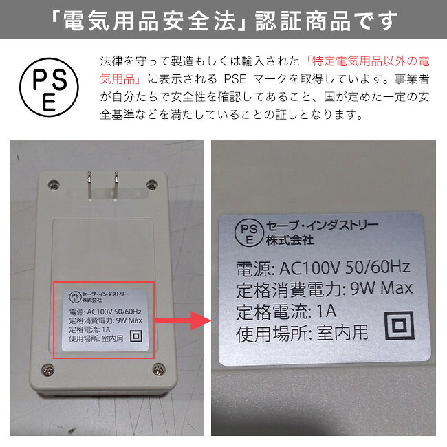 ネズミ撃退器 SV-2256の解説 超音波&電磁波でネズミを撃退。コンセントに差し込むだけで簡単にセットできるネズミ対策グッズです。キッチン・厨房・食料品店・倉庫などに。 有害なものを発生しないので、お子様やペットや食品に対しても安全です。 ネズミ撃退器 SV-2256の詳細 商品名: ネズミ撃退器 SV-2256 説明: ネズミ 撃退 ねずみ 鼠 ねずみ駆除 超音波 ネズミ退治 害獣 予防 対策 忌避日本製か海外製か 中国 サイズ(約) L67×W50×H113mm 重量(約) 130g 材質 ABS樹脂 PSマークの種類 特定電気用品以外の電気用品 届出事業者名 セーブ・インダストリー株式会社 電源 AC100V 50/60Hz 定格消費電力 9W Max 定格電流 1A PSE適合 日本の電気用品安全法(PSE)の技術基準に適合した電気用品です。 注意 ※ディスプレイの環境上、実際のカラーが再現できない場合がございます。