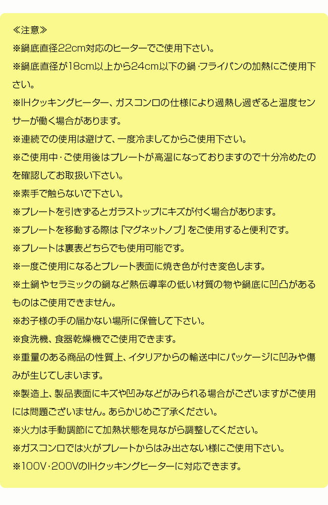 FRABOSK IHヒーティングプレート 22cm フラボスク マグネットノブ付きの解説 IHクッキングヒーターで加熱できなかったアルミ製のフライパン等を加熱可能にするヒーティングプレート(アダプター)です。 間接的かつプレート全体で熱を伝えるのでIH・ガスコンロで長時間弱火で煮込み料理などで焦げ付きにくくなるヒートディフューザーとしてもご使用できます。 (推奨鍋底直径18~24cm) ガスコンロでも五徳の上にのせるアダプターとしてご使用できます。熱が均等に広がる為、煮物の焦げ付きを防止するヒートディフューザーとしてもご使用できます。 IHヒーティングプレート 22cm フラボスク マグネットノブ付きの詳細 商品名: IHヒーティングプレート 22cm フラボスク マグネットノブ付き 説明: ガス用のアルミ製のフライパン等をIHで加熱する事が可能になる IH対応にもガス対応にも使える便利なヒートプレート IH・ガスコンロ両用のアダプター 用途・場所: キッチン 台所 カフェ 一人暮らし ひとり暮らし アパート 新生活 料理 調理 コーヒー エスプレッソ エスプレッソメーカー 対象: 自分用 家族 男性 女性 友人 友達 カテゴリー: キッチン用品 便利グッズ商品名 IHヒーティングプレート 22cm フラボスク マグネットノブ付き 型番/JAN ヒーティングプレート:099.02.3/4540526007269、マグネットノブ:HNIKNOB/4540526007214 サイズ(約) ヒーティングプレート:Φ22.4cm×2.8mm、マグネットノブ:32×32×100mm 重量(約) ヒーティングプレート:510g、マグネットノブ:32g 材質 ヒーティングプレート:ステンレス‐銀‐アルミ‐銀‐ステンレスの5層構造、マグネットノブ:木・スチール・マグネット 原産国 ヒーティングプレート:イタリア、マグネットノブ:日本 注意 ※ディスプレイの環境上、実際のカラーが再現できない場合がございます。※本製品はご家庭用です。業務用IHクッキングヒーター・コンロではご使用しないで下さい。 ※IHクッキングヒーターの温度センサーが正しく働かない場合、オーバーヒートによる歪み・変形が生じる場合がございます。 ※土鍋やセラミックの鍋、ガラス製ポットなど熱伝導率の低い材質の物や、鍋底に凹凸があるものはご使用できません。 ※本製品はIHクッキングヒーターでIHヒーティングプレート自体を加熱し、上に載せる鍋等に熱伝導で熱を伝えて加熱する原理です。このため、IH専用の鍋よりも加熱時間を長く必要とします。また、ご使用の鍋や環境により加熱時間に差があります。加熱時間が長くなるのは上記性質による仕様ですので、あらかじめご了承下さい。 ※重い商品の性質上、イタリアからの輸送中にパッケージに凹みや傷みが生じてしまいます。あらかじめご了承ください。(商品には問題ございません) ※マグネットノブは手作り品の為、傷や歪み等作りが粗い部分がみられます。 ※一度ご使用になるとプレート表面に焼き色が付きますが不良ではございません。 ※鍋底直径22cm対応のヒーターでご使用ください。 ※鍋底直径が18cm以上から24cm以下の鍋・フライパンの加熱にご使用下さい。 ※食洗機、食器乾燥機でご使用できます。 ※100V・200VのIHクッキングヒーターに対応できます。 ※IHクッキングヒーターをご使用時に鍋が振動したり振動音が生じる場合がございますが、これはIHクッキングヒーターの特性によるもので、異常ではありません。この場合は火力を下げたり鍋の位置をずらして置き直すと解決する場合があります。 ※高出力のIHクッキングヒーターでは一般的に振動や振動音が大きくなる傾向があります。まれにIHクッキングヒーターの火加減や、鍋の材質・形状等の違い、それらの組み合わせにより、共振現象が発生し、鍋に大きな振動が生じる場合がございます。このような現象は商品の不具合によるものではございませんので、返品・交換の対象にはなりません。 12cmプレート 14cmプレート 22cmプレート ▼ご注文前に必ずご確認下さい。詳細はアイコンをクリック!