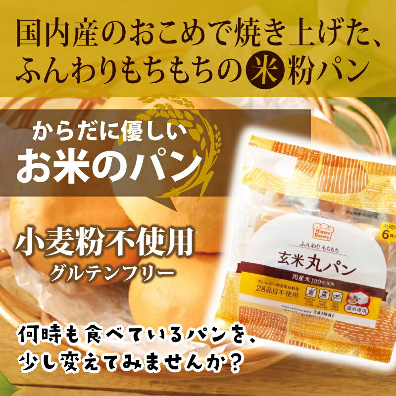 名称 玄米丸パン 原材料 玄米粉(うるち米(国産)、砂糖、食用こめ油、生イースト、食塩/トレハロース、増粘剤(HPMC)、乳化剤 内容量 6個×3袋入 賞味期限 製造日から90日 保存方法 直射日光、高温多湿はお避け下さい。 販売者 君和株式会社 〒4520811 愛知県名古屋市西区砂原町236-1