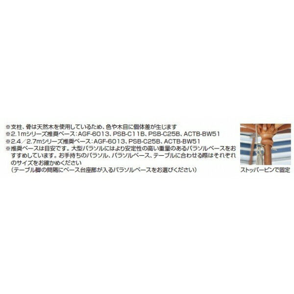 商品番号10113001メーカータカショーサイズ高さ 2390.0mmカラーベージュ通常納期5〜10日後発送直径(mm)2400素材樹脂重量(kg)6.5配送区分1※商品により配送可能エリアが異なります。配送エリア表をご覧ください。工事対応この商品は工事を承っておりません。マーケットパラソルは、その名の通り古くからヨーロッパの街角に立つマーケットで日よけとして活躍し、人々に親しまれてきたパラソルです。今日の日本ではまぶしい日差しから人々を守り、快適な空間を提供するガーデンにおいての必須アイテムとなっています。備考屋上などの高所や強風が予測される場所には、パラソルを設置しないでください。● パラソルご使用時は支柱下部、中央部の2カ所を固定してください(パラソルベースとテーブルを併用してください)。ご使用前にパラソルベースにしっかりと固定されていることを確認してください。パラソルは管理者のもとで使用してください。離れるときは必ず閉じてください。● 強風時や雨天時はパラソルを室内に収納してください。予期しない突風の場合にも、すみやかに閉じる、収納するなどの対処をしてください。パラソルは日よけ専用です。防水性はありません。