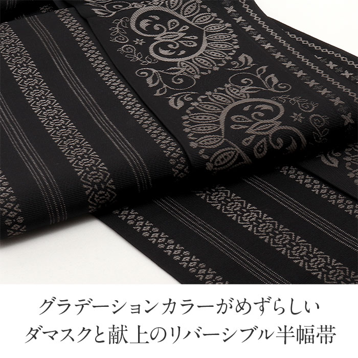 【クーポンご利用で最大10%OFF!】半幅帯 黒 リバーシブル 本場筑前博多織 小袋帯 未使用 リバーシブル 正絹 ダマスク 献上 Kissteオリジナル 協和織工場 日本製 小紋 紬 街着 カジュアル 半巾帯 小袋 両面 博多 おび キステオリジナ