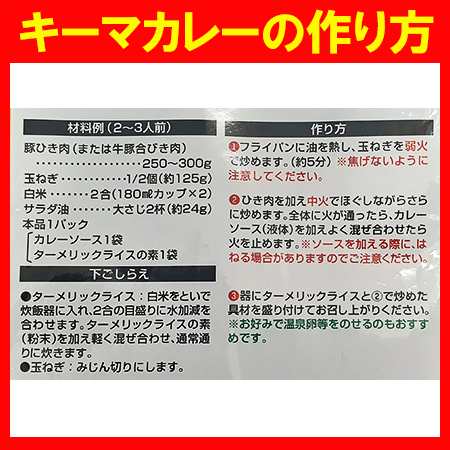調味料 はこちら 名称:キーマカレー の素 内容量:キーマカレーの素 1袋( カレーソース、炊飯用調味料 )×3袋 殺菌方法:調味料 たれ は気密性容器に密封し、加圧加熱殺菌 保存方法:きーまかれー の素 は、直射日光を避け涼しいところで保管してください。 賞味期限:調味料 ソース は2ヶ月以上 配送方法:キーマカレーの素 送料無料 ポスト投函(ヤマト運輸 ネコポス・日本郵便 ゆうパケット)でお届け 送料:キーマカレー 送料無料・送料込み 発送元:北海道 ポイント・きた蔵の畑 「 キーマカレー ダイショー キーマカレーの素 ひき肉と玉ねぎで作る 調味料 ソース カレーソース ターメリックライスの素 」※キーマカレーの素 は、ポスト投函の為、配送日時指定は出来ません。 ●本品のセット内容 【 カレーソース 】16種類の香辛料で豊かな風味と程よい辛さに仕上げたカレーソースです。 【 ターメリックライスの素 】ターメリック・ガーリック・クミン等を組み合わせました。風味豊かで色鮮やかなごはんに仕上がります。 原材料名 カレーソース【果糖ぶどう糖液糖(国内製造)、食塩、カレー粉、しょうゆ、クミン、醸造酢、にんにく加工品、ポークエキス、赤唐辛子、カルダモン、こしょう、オレガノ、酵母パウダー/酒精、増粘剤(加工デンプン、キサンタン)、調味料(アミノ酸等)、着色料(カラメル、パプリカ色素)】 炊飯用調味料【コーングリッツ(国内製造)、ターメリック、ローストガーリックパウダー、クミン、食塩、フライドオニオンパウダー、こしょう/炭酸カルシウム、微粒二酸化ケイ素】 栄養成分 1人前(34g)あたりの栄養成分 エネルギー 43kcal たんぱく質 0.9g 脂質 0.8g 炭水化物 9.0g 糖質 7.3g 食物繊維 1.7g カルシウム 31mg ビタミンB1 0.004mg 食塩相当量 2.8g 材料 2~3人前 ■豚ひき肉(または牛豚合びき肉)・・・250~300g ■玉ねぎ・・・1/2個(約125g) ■白米・・・2合(180mlカップ×2) ■サラダ油・・・大さじ2杯(約24g) ■本品・・・カレーソース1袋 ターメリックライスの素1袋 作り方 1 ●ターメリックライス:白米をといで炊飯器に入れ、2合の目盛りに水加減を合わせます。ターメリックライスの素を加え軽く混ぜ合わせ、通常通りに炊きます。 ●玉ねぎ:みじん切りにします。 2 フライパンに油を熱し、玉ねぎを弱火で炒めます。(約5分) ※焦げないように注意してください。 3 ひき肉を加え中火でほぐしながらさらに炒めます。全体に火が通ったら、カレーソースを加えよく混ぜ合わせたら火を止めます。 ※ソースを加える際に、はねる場合がありますのでご注意ください。 4 器にターメリックライスと3で炒めた具材を盛り付けてお召し上がりください。 ※お好みで温泉卵等をのせるのもおすすめです。 一口メモ ※炊き上がったターメリックライスに、バター(約10g)を混ぜ合わせるとコクが増します。 アレルギー情報 小麦・大豆・豚肉 「 キーマカレー ダイショー キーマカレーの素 ひき肉と玉ねぎで作る 調味料 ソース カレーソース ターメリックライスの素 」