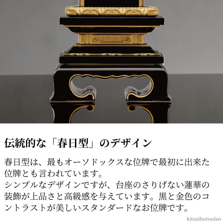 スペック ●生産国 日本 ●材質 ヒバ材 ●仕上げ 本金粉仕上げメイドインジャパンの技が光るスタンダードなお位牌 「春日型」は最もオーソドックスな形の位牌で、最初にできた位牌とも言われています。 シンプルなデザインに台座の蓮華がさりげなく上品さを与えています。 永代に渡り末永く手を合わせていただきたいという想いを込め、 職人の手によって丁寧に作られた100%日本産のお位牌です。