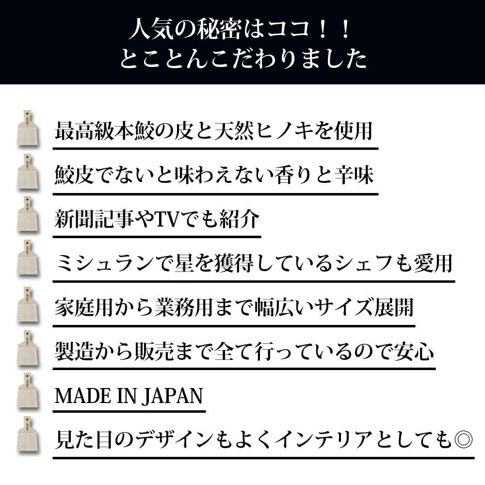 商品説明 鮫皮で生わさびをすりおろすと生わさびの細胞が細かく破壊され香りと辛味が生まれます。 また金物で出来たおろし器でもよいのですが、 金気で風味や辛味を損なうことがあり、 粘りも少ないため生わさび本来の風味、 辛味が出ないからです。 また、生わさびの最も大事な栄養分も引き出せないからです。 生わさびのおろし方 1:葉の部分をそぎ落とす 2:コブをあらく削り取る 3:たわしで洗う 4:葉付きの方から輪を描くようにおろす コツ ・力を入れず、ゆっくり「の」の字を書くように丸くすりおろします。 きめが細かく、粘りのあるクリーム状になれば、おいしいわさびの出来上がりです。 ・わさびだけでなく、ネギやニンジンなどの野菜やリンゴなどの果物にも使用できます。 素材がまるで雪のように溶け、果肉とジュースの中間の軽いムース状になるので 料理を出す直前に加えることで、心地よい香とリフレッシュ感を与える事が出来ます。 サイズ/材質/産地 ・特大サイズ: (A)23.7×(B)11.1×(C)11.1×(D)11.8cm ・超特大サイズ: (A)27.3×(B)11.3×(C)11.3×(D)14.0cm ・素材:鮫革、木(国産檜) 食洗機 食洗機不可 【注意事項】 ●モニターの発色により、実物と見え方が異なる場合があります。 ●一度、使用した後、さっと水洗いをし、日陰干しをして乾かしてください。 おろし板に水分を含んだ状態で、一日に何度も連続で使用しますと、 皮がムレてはがれやすくなります。 お湯や水につけたり、天日に干すとはがれの原因になります。 水やお湯につけないでください。 ●長い間、毎日木と皮に水分が多く含まれると鮫皮や木が破損する場合がございます。 また乾燥後、木部が割れたり、湾曲する場合がございます。 時々鮫皮おろし板を休ませて日陰干しをしてください。 ●本鮫皮は天然の最高級皮で、場所によっては多少目が異なります。 ★頻繁にご使用になられる場合は、2枚の鮫皮おろしを交互に使用されるのが長持ちの秘訣です。(※長次郎 特大を使用)