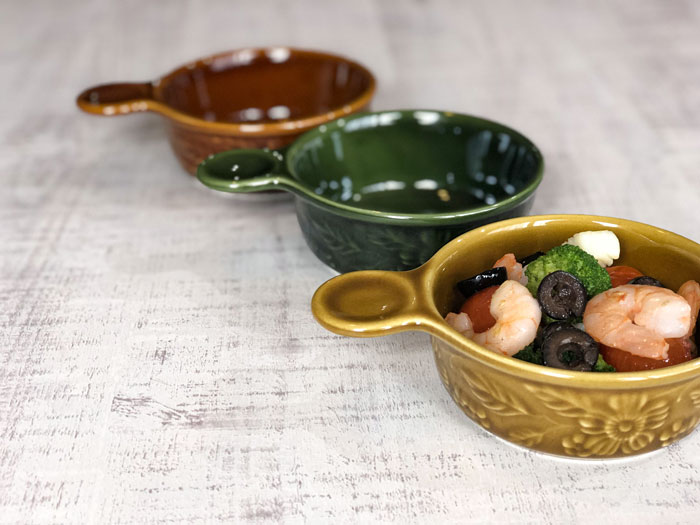 グラタン皿 一人用 レリーフ 手付 スープボウル S アヒージョ 鍋 おしゃれ 日本製 選べる2色