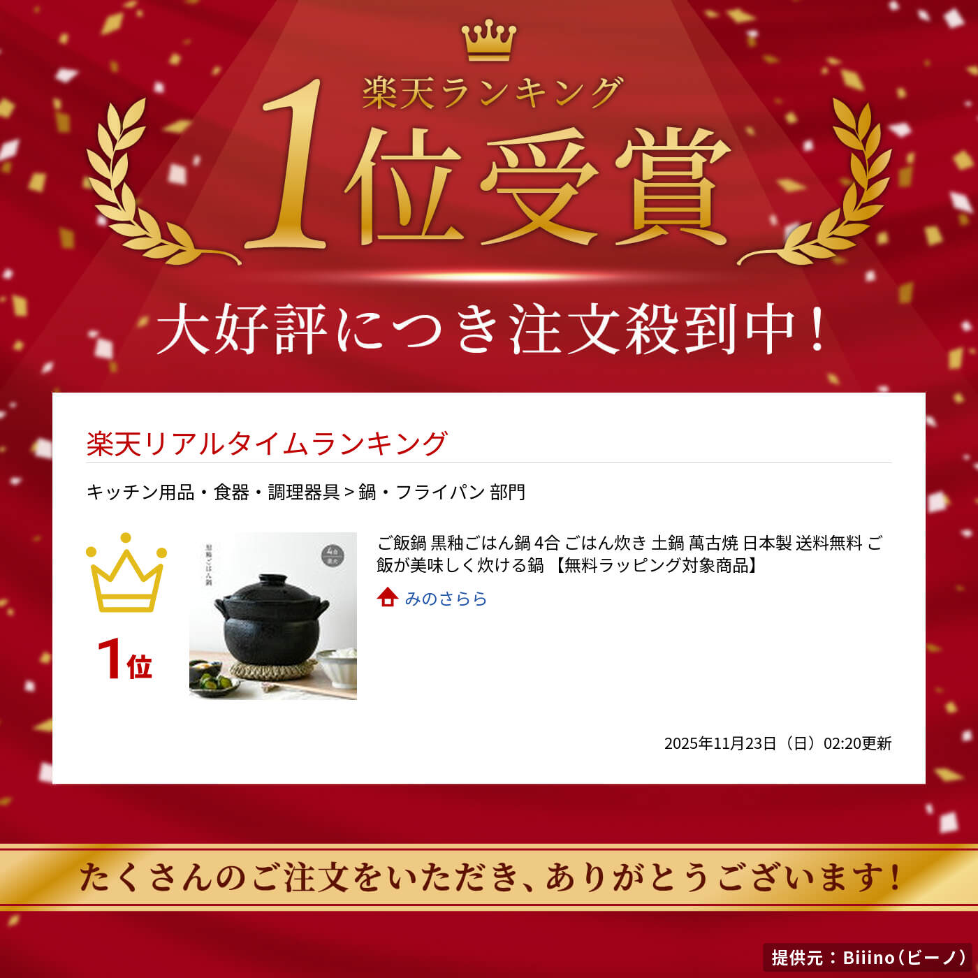 商品につきまして 中蓋付きの2重フタでしっかり圧力をかけることにより、ふっくらおいしいごはんが炊きあがります。おうちでかまど炊きのようなごはんをお楽しみいただけます。 白米はもちろん、玄米や炊き込みごはんもおいしく炊きあがります。 土鍋の内側にはお水加減の目安となるラインが入っています。 内容 黒釉ごはん鍋 4合炊き 1個 サイズ・素材 ※陶器は焼き物のため個体差がございます。多少の誤差はご了承ください。 ■サイズ(cm) 幅 24.5 奥行 20 高さ 19.5 重量 約2,900g 満水 約2,000ml ■素材 耐熱陶器 日本製(萬古焼) ご使用につきまして ○使用可 ⇒ 直火、オーブン、電子レンジ、食器乾燥機 取扱説明書をお読みになり、正しくお使いください。 ・直火専用です。電子レンジの使用につきましてはごはんの温めでご使用頂けます。 ・使いはじめにまれに底から水分が染み出すことがありますが異常ではありません。残りごはんでお粥を作るとおさまります。 ・使いはじめのうちに、味ご飯や炊き込みご飯を炊くと、においが付くことがございます。 ラッピング こちらの商品はラッピング無料です。下のボタンを押すとラッピングページへ移動します。リンク先の無料ラッピング説明をお読みください。 ※ラッピング無料の記載のない商品は有料でラッピングを承ります。無料と有料ラッピングをまとめるのはラッピング代金が発生いたします。 ※この商品専用箱のため他の商品とまとめてラッピングをご希望の場合は、別途有料でお受けさせて頂きます。 備考 発送の目安は、それぞれの商品ページにてご確認ください。ご注文・決済・発送・欠品等についてのお知らせは、メールでご連絡させて頂きます。 必ず受信が確認できるメールアドレスをご登録ください。商品の色やイメージはお使いの環境により、実際と異なる場合がございます。 商品の特性上、釉薬の濃淡、釉薬の厚みによる凹凸、小さな黒い点・穴・突起、若干のサイズ誤差などがございます。 これらの状態は、製造過程において必ず発生する状態のため良品とさせて頂きます。メーカーの品質基準をクリアし、弊社によりさらなる検品を経てお客様へお届けいたします。あらかじめご了承くださいませ。 内祝い 引っ越し 新築祝い 結婚祝い 新生活 お中元 御中元 御歳暮 お歳暮 ギフト 贈り物 お返し 引き出物 母の日 父の日 敬老の日 お誕生日 単身 ひとり暮らし などにお薦めです。 ギフト&ラッピング無料 ギフトにおすすめ。のしはラッピングページで選べます。黒白グレー系1合 2合 3合 4合 みのさらら *上の画像を押すとご飯鍋の特設ページが表示されます。中蓋付きの2重フタでしっかり圧力をかけることにより、ふっくらおいしいごはんに。 おうちでかまど炊きのようなごはんをお楽しみいただけます。 白米はもちろん、玄米や炊き込みごはんもおいしく炊きあがります。 *上の画像を押すとご飯鍋の特設ページが表示されます。