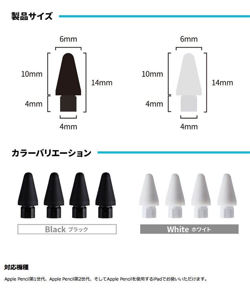 ●合わせて買いたい商品●気になる商品ifeli 「Apple Pencil用 一体型シリコンカバー付きチップ」は、チップとシリコンカバーを一体化することで摩擦力を高めた、Apple Pencilの交換用チップです。Apple Pencilのペン先として取り付けることで適度に引っ掛かる摩擦力が得られ、ペーパーライクフィルムなどを使用していないiPadのガラス面でも、ブレのないしっかりした書き味を楽しめます。ペン先からシリコンカバーが一体型でずれにくくなっているため、使用中や保管中になくなる心配がありません。■ 滑らかな滑りを実現した低摩擦タイプチップの摩擦力レベルは純正品<低摩擦<高摩擦となっております。低摩擦タイプはApple純正チップに比べ、強すぎない適度な摩擦力が備わっています。程よい滑らかな書き味はスケッチなどに適しており、滑りすぎないライトな書き味で、初心者の方でも気持ちよくお使いいただけます。■ ペーパーライクフィルム無しでも滑らないチップと一体化したシリコンカバーが摩擦力を高めており、フィルムなどを貼っていない状態のiPadのガラス面でも滑ることなく、しっかりした書き味が得られます。書き味を出すためにペーパーライクフィルムで画面を覆う必要がないため、iPadの高精細な画面の美しさを犠牲にすることなくそのまま楽しめます。■ 外れない一体型ペン先チップの上にかぶせて使うカバータイプとは異なり、ペン先ごと交換する一体型タイプなので、使用中や保管中に外れにくい仕様となっています。■ ブレのないしっかりした書き心地絵を描く時も文字を書く時も、適度な抵抗感でブレのないしっかりした書き心地を提供します。■ 静音性の向上プラスチックのペン先を覆うシリコン素材は、滑らかなゴムのような質感です。ガラス面とぶつかりコツコツと鳴る筆記音が低減され、より集中して作業を行うことが出来ます。書き心地と使用中の音が気になる方におすすめです。■ 画面をキズつけにくいApple Pencilの使用でチップが画面に当たる際、シリコン素材がクッションとなるため、iPadを傷つける心配がありません。■ 簡単装着純正のチップからそのまま取り換えるだけなので、簡単に装着が行えます。■ 対応機種Apple Pencil第1世代、Apple Pencil第2世代、そしてApple Pencilを使用するiPadでお使いいただけます。「交換の仕方」Apple Pencilのペン先を反時計回りに回してペン先を取り外します。アイフェリチップをApple Pencilの本体に時計回りに回して取り付けます。[仕様情報]サイズ : 0.6x1.4x0.6cm素材 : 外側シリコン・内側プラスチック重量 : 0.2g(1個当り)※ 低摩擦チップの場合、低反射、指紋防止、ペーパーライクフィルムをiPadに使用している場合、筆記音が発生することがあります。[メーカー]アイフェリ ifeli型番JANホワイトIFT03LW8809737000305ブラックIFT03LB8809737000329[対応] Apple Pencil[対応] Apple Pencil (第2世代)[性能] 低摩擦[材質] シリコン[色] ブラック[色] ホワイト[シリーズ]s_4944385285ifeli Apple Pencil用 一体型シリコンカバー付きチップ 低摩擦 4個入り アイフェリ