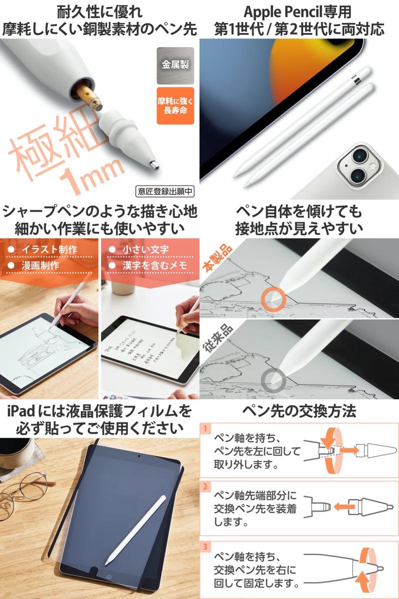 ご注意ください※iPadには必ず液晶保護フィルムを貼ってご使用ください。 ※特定のアプリによっては ご使用できない場合がございます●合わせて買いたい商品●気になる商品先端が見やすく繊細な描写が可能な、ペン先が金属製のApple Pencilの交換ペン先です。第1世代、第2世代両方に使用可能です。※iPadには必ず液晶保護フィルムを貼ってご使用ください。■Apple Pencilの交換ペン先です。第1世代、第2世代両方に使用可能です。 ■太さ1mmの極細ペン先で視界を邪魔せず、ペン自体を傾けても接地点が見えやすく細かい描写に最適です。 ■ペン先は、耐久性に優れ摩耗しにくい金属製素材を使用しています。ペン先が削れにくいので、交換頻度が減りランニングコストを抑えることが可能です。 ■漫画やイラスト制作のような細かい作業にも使いやすいスリムペン先タイプです。 ■ペン先が細いため、イラストだけではなく小さな文字や漢字を含んだメモを書くのにも最適です。 ■ペーパーライクフィルムと一緒に使うと、更に紙に描いているよう描き心地になります。 ■スペアがついた合計2個入りです。 ■純正のペン先よりも硬く細いペン先のため、シャープペンシルのような描き心地です。 [仕様情報]外形寸法 : ペン先約1mm 材質 : 銅[メーカー]エレコム ELECOM (エレコム)型番JANP-TIPAP014549550235136[対応] Apple Pencil[対応] Apple Pencil (USB-C)[対応] Apple Pencil (第2世代)[性能] 極細[色] ホワイトエレコム Apple Pencil専用 交換ペン先 金属製 極細 太さ1mm 2個入り ホワイト # P-TIPAP01 エレコム