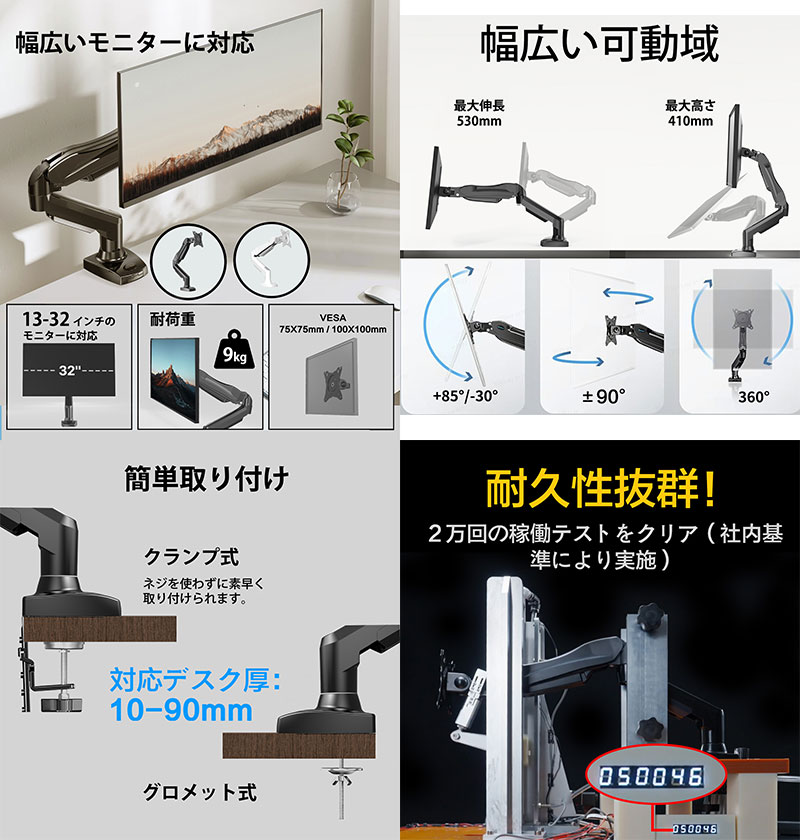 ●気になる商品HUANUO HNSS31B/Wは、高品質と高いコストパフォーマンスを兼ね備えたシングルアームのモニターアームです。この製品は、13インチから32インチまでのモニターに対応し、最大荷重は2〜9kgです。主にオフィスでの使用を想定しており、ガススプリング機構によりモニターの角度や高さを自由に調整できます。クランプ式とグロメット式の二種類の固定方法に対応しているため、設置場所を選ばずスムーズに取り付けが可能です。オフィスワークや家庭での利用に最適です。■ 幅広いサイズのモニターに対応13インチから32インチまで、幅広いサイズのモニターに対応可能なシングルアームのモニターアームです。最大荷重は2〜9kgで、様々なモニターサイズに対応できます。■ 快適な作業環境このモニターアームは最大高さ410mmまでディスプレイを持ち上げることができ、長時間の作業でも首や肩の負担を軽減します。正しい姿勢を保ち、快適な作業環境を実現します。■ 簡単に取り付けが可能クランプ式とグロメット式の二種類の取り付け方法に対応しており、デスクにしっかりと固定できます。さらに、迅速なインストールを可能にするクイックインストールシステムを備えており、ワンタッチで固定できるカチッとしたデザインです。■ 多角度調節モニターの位置や高さを調節することで、正しい姿勢や目線に合わせて使用でき、肩こりなどの不調を軽減します。また、上下左右だけでなく前後にも移動可能で、画面との距離も調節できます。[仕様情報]対応の画面サイズ: 13-32耐荷重: 2-9KG高さ調整範囲: 26 CMアームの最大伸展長さ(前に):53 CMアームの最大伸展長さ(上に):40 CMスイベル(左右に回転):180°チルト(上下に傾ける):+85°/-30°回転: 360°ベース: 2*USB-A端子を出す穴、コード付属無しVESA: 75 x 75 / 100 x 100 mmhead size: 115*115 mmセット内容 : アーム本体 説明書/ユーザーマニュアル 組み立て用ネジセット[保証期間]5年[メーカー]ファーノー Huanuo型番JANブラックHNSS31B4580784261812ホワイトHNSS31W4580784261829[対応] 13-32インチサイズ[色] ブラック[色] ホワイト[シリーズ]s_5313546057Huanuo ガススプリング式モニターアーム 13-32インチサイズモニター対応 エントリーシリーズ シングル画面 ファーノー