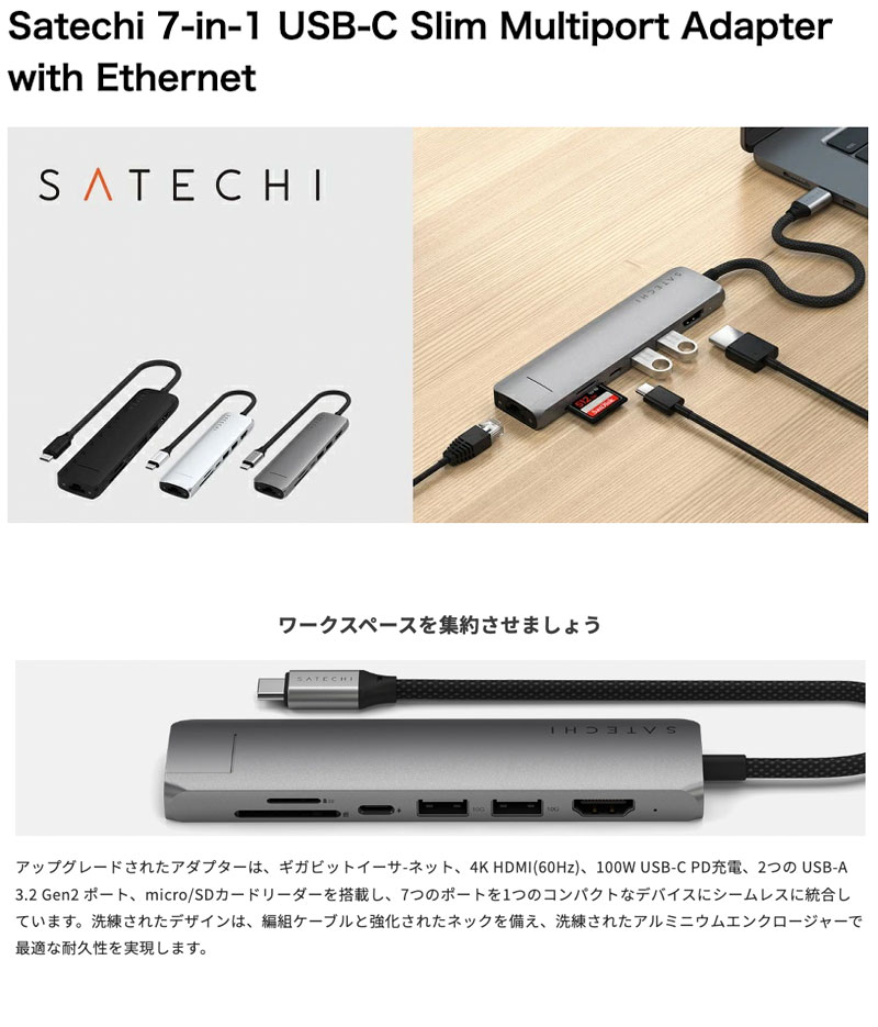 【セール★〜12/1まで】 Satechi 7-in-1 USB-C Slim Multiport Adapter with Ethernet PD対応 スリムマルチポートアダプター WITH イーサーネット (USB Type-C アダプタ)