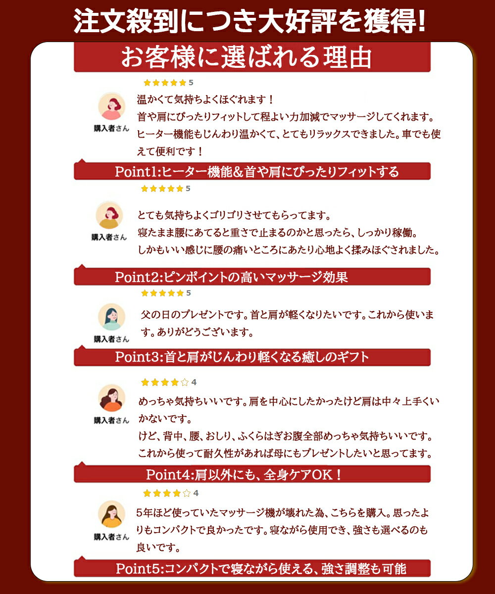 商品情報 ★重量:約1.8kg ★サイズ:41*40*14CM ★マッサージ部位:頸椎/肩/首/腰/背中/太もも/足/腹 ★素材:本体:PP ★外カバー:ポリエステル85%、レザー15% ★内カバー:ナイロン80%、ポリウレタン20% ★セット内容 基礎版:マッサージ枕本体*(リモコンなし)1、日本語取扱説明書*1 標準モデル:マッサージ枕本体(リモコンなし)*1、日本語取扱説明書*1 進化版:マッサージ枕本体(リモコン付き)*1、シガーソケット*1、日本語取扱説明書*1 デラックス版:マッサージ枕本体(リモコン付き)*1、シガーソケット*1、日本語取扱説明書*1 おすすめのポイント:三段階調節/ヒーター付/家庭・車載両用可能/コンパクト/簡単操作/3D揉み玉/人の手を模擬する/温熱機能/スマホ首を予防する/タイマー/人体工学設計/多機能/通気性良い/変形しにくい 商品特徴 【簡単 ストレッチとです温熱】 長時間の デスクワーク ・ テレワーク、または スマホ や PC の使いすぎで、首 や 肩 が気になる感じはありませんか?さっとベッドですに置いてスイッチオンすればグラフェン素材で即温!ワンタッチでまるで温泉で浮いているような心地良さに。1日5分〜30分ご使用いただけます。そんなあなたに首 肩 の周りを伸ばして自宅で簡単に 首 の ストレッチ が出来る 首枕です。 ・【タイマー】 またタイマーがついているので安心してご利用いただけます。枕カバーは肌に優しく、ソフトで丈夫な素材生地を採用します。肌触りが抜群して、強い通気性を持つので長時間の横たわるでも蒸し暑くないです。 ・【全方位マッサージ&持ち運び簡単】 小型軽量なので、いつでもどこでも使用便利!人間工学に基づいたデザインは、首・肩・背中・腰・太もも・ふくらはぎ・足裏など気になる部分をマッサージできます。家庭用電源と車用電源アダプターが付いていますので、家だけでなくオフィスや車、旅行なども最適! ・【プレゼントとして最適】 恋人や奥様、旦那様。愛する大切な方へ。 ご両親への感謝に、喜んでいただけるはずです! お世話になっている職場の方や友人へ、体のケアのプレゼントに! 毎日頑張った自分にご褒美をあげる!自宅でエステ級の全身ケア! 自分へのご褒美として、体をケアして、健康を大切にします。 【ご注意】 ※該当商品はリラックス用品です。医療用品ではございません ※手作業での採寸の為、若干誤差がある場合があります。ご了承下さい。 ※商品の輸送時間が長いため、発送していた際に外装の破損や輸送の途中に付いた小さなキズによる返品はお受付しかねます。 関連キーワード ストレッチ 機能 枕 肩甲骨 頸椎 背中 温め あったか まくら スマホ首 ネックストレッチャー 実用的 猫背 解消 グッズ 首ヨガ 温熱 押圧 温め 筋肉 首 肩 頭の重みで無理なく牽引ケア。背中まわりを温めながら伸ばす ネック 首枕 洗える枕 あったか グッズ 癒し 男性 女性 おすすめ リフレッシュ ギフト ほぐす 効果 出張 職場 自宅 プレゼント 電動 ギフト 健康 あったか 母の日 父の日 誕生日 お祝い 御祝 お返し 人気 おすすめ 癒し 新年 ギフト 敬老の日 母の日 父の日 記念日 結婚記念日 お誕生日 ギフト プレゼント 内祝い 贈り物 祝い 米寿祝い お礼送別会 歓送迎会 20代 30代 40代 50代 60代 70代 80代 おしゃれ フラワーギフト お花 ランキング マッサージ器 多機能マッサージ枕 小型 全身 腰 足 背中 肩 首 ems 電熱 マッサージ機 ネックマッサージャー 温熱 ems ネックピロー お歳暮 敬老の日 父の日 プレゼント 日本語説明書付き \ラッピング対応/【2年保証】マッサージ機 車・家庭 兼用 首 肩こり マッサージ枕 小型 多機能 マッサージクッション 車兼用 全身 腰 足 背中 肩 首 電熱 マッサージ機 クッションマッサージャー ネックマッサージャー 肩こり 肩もみ 温熱ヒーター マッサージ枕 マッサージ機 小型 マッサージ機肩 マッサージ機 足 マッサージ機 プレゼント マッサージ機腰 マッサージ機 ランキング マッサージ機 全身 ッサージ機 おすすめ マッサージ機 おすすめ肩 マッサージ機 おすすめ全身 マッサージ機 おすすめ足 マッサージ機 おすすめ腰 マッサージ機 おすすめ小型 マッサージ機 おすすめ首 マッサージ機 おすすめ メーカー マッサージ機 おすすめ プレゼント ッサージ機 小型 マッサージ機 小型 人気 マッサージ機 小型 女性使い方 マッサージ機 小型 全身 マッサージ機 小型 肩 マッサージ機 小型 ランキング マッサージ機 小型 肩こり マッサージ機 小型 安い マッサージ機 小型 女性 マッサージ機 小型 足 マッサージ機 肩甲骨 マッサージ機肩おすすめ マッサージ機 足裏 マッサージ機足ふくらはぎ マッサージ機 足裏ふくらはぎ マッサージ機 足の裏 マッサージ機 足のむくみ マッサージ機 足だけ マッサージ機 足痩せ マッサージ機 足首 マッサージ機 足パナソニック マッサージ機 プレゼント マッサージ機 プレゼント 男性 マッサージ機 プレゼント 女性 マッサージ機 プレゼント 男性腰 マッサージ機 プレゼントおすすめ マッサージ機 プレゼント嬉しくない 
