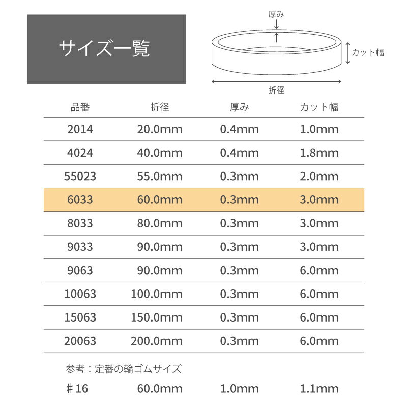 【製品名】モビロンバンド 折径60mm 50g(約347本) 通常タイプ 【メーカー】日清紡ケミカル株式会社 【外寸法】折径:60mm カット幅:3mm 厚み:0.3mm 【成分】熱可塑性ポリウレタン100% ★特 徴★ 薄くてよく伸び、べたつかない。 丈夫で長持ち、しっかり結束。(長期間使っていても、くっついたり、切れたりしません) 天然ゴムを使ってゴムアレルギーになってしまう方でも安心して使用できます。(アレルギーの原因となるものを含んでいません) 金属に使っても、サビたり黒ずんだりしません。 安心な素材を使っていますので、お弁当や食品の結束にいかがでしょうか。(食品衛生法) 安全、安心の MADE IN JAPAN !! 書類を輪ゴムで束ねて保存していたら、書類に輪ゴムがくっついた・・・ 輪ゴムで髪を束ねると、からまってひどい目にあった・・・ いざ輪ゴムを使おうとしたら、ポロポロ切れて使えなかった・・・ ファイルを輪ゴムで束ねようとしたら、輪ゴムのサイズが足らなかった・・・ などなど、誰しもこんな経験が一度はあるのではないでしょうか。 でも大丈夫!!こんな悩み、モビロンバンドなら一発解消。 「輪ゴムなんてすぐ切れるし使い捨て」こんなイメージありませんか? でも、資源を無駄にして本当に大丈夫? 今はリユースの時代、限りある資源大切に使わなきゃ!! モビロンバンドなら丈夫で繰り返し使えるから、エコでかつ経済的。 かわいい赤ちゃん、とても好奇心が旺盛でなんでも触ってしまいますよね。 でも、ちょっと待って。その輪ゴム安全? モビロンバンドなら大丈夫。日本製で食品衛生法に適合しているから安心です。 輪ゴムの進化版、それがモビロンバンド!! ★お客様の声★ ・ 伝票の保管に使っています。今までの天然輪ゴムは切れたり、劣化したりしていましたが、モビロンバンドは耐久性もよく、切れにくいです。 ・ 透明のモビロンバンドなら、バーコードの上からでも読み取れるので、バンドの結束位置を気にしなくてすみました。 ・ トレーを束ねるのに、大きいサイズの輪ゴムを探していたのですが、輪ゴムではなかなか色んなサイズが無く、このモビロンバンドなら サイズが揃っていて助かりました。 モビロンバンド一覧はこちら