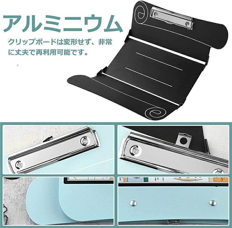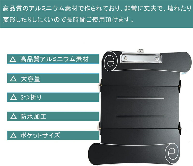 クリップボードは、高品質のアルミニウム素材で作られており、非常に丈夫で、壊れたり変形したりしないので、安心してご使用いただけます。 右側には固定用の合金クリップが付いているので、使用中に書類、請求書、領収書が落とすことを心配する必要がありません。 ファイルのクリップ力が強い、1~50枚のA4紙を挟んで、一枚で挟まれることもできます。 ファイルボードはビジネスに必要な物を1冊に収納できます、軽量で出勤できます。 三つ折りクリップボードはスクラブポケットにぴったりフィットします。軽量構造で表面が滑らかさを感じ、書いている間も 180 ° フラットに保ちます。 会議やインタビュー、学校の授業、セミナーやイベントでのメモなどいろいろな場面で活躍してくれる多機能フォルダー。卒業祝いや就職祝いに最適なプレゼントです。 実用的で携帯性に優れているため、このクリップボードは、看護師、医師、インターン、医学生、医療専門家への必須アクセサリーまたはお気に入りの贈り物としてもおすすめです。
