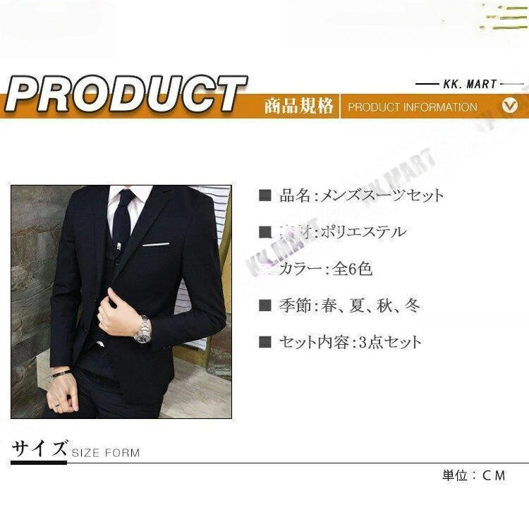 ■ 品名:メンズスーツセット■ 素材:ポリエステル■ カラー:全6色■ 季節:春、夏、秋、冬■ セット内容:3点セットセットアップ メンズ スーツ ジャケット テーラードジャケット テーパード スラックス 結婚式 スーツ メンズ ビジネススーツ オールシーズン ビジネススーツ メンズ 大きいサイズ スリムスーツ 春 夏 秋 冬 春夏 秋冬 おしゃれ カジュアル 成人式 シングルスーツ 就活 通勤 紳士服 冠婚葬祭 フォーマル メンズスーツセット カジュアルスーツ