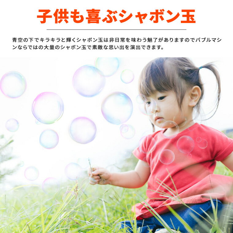 大量のシャボン玉を自動噴射自分で作るシャボン玉も楽しいですがスイッチ入れるだけで自動でシャボン玉を噴射するため、シャボン玉に囲まれいつもと違う風景を楽しむことができます。 子供が喜ぶ夏の定番青空の下でキラキラと輝くシャボン玉は非日常を味わう魅了がありますのでバブルマシンならではの大量のシャボン玉で素敵な思い出を演出できます。 20Wの高出力パワー業務用でも利用できる高出力なバブルマシン。イベントなど広い場所でのご利用にオススメです。 バブル液を1本サービスお試し用のバブル液が付属しているので到着後にバブルマシンを楽しむことができます。※ボトル1本に対して水を1500mlで薄めてご利用してくだい 便利なリモコン付き。電源スイッチにてリモコン操作でご利用をするか手動でご利用するか選らんでご利用ができます。 前面から出る風の向きを調整できるので、シャボン玉を遠くに飛ばしたり高く飛ばしたりすることができます。様々なシーンで活躍。結婚式、キャンプ、バーベキュー、ライブ、プール、お祭りなど様々なイベントで幻想的な演出を子供から大人まで楽しめます3.5時間の長時間噴射。タンクに1Lのリキッドが入る大容量のため、満タンにするれば、長時間シャボン玉を楽しむことができます。またリキッド残量の確認も可能です。 商品仕様 品名 バブルマシン 角度調整可 20W(bubble-01-20W) サイズ(約) 高さ26cm×幅14cm×奥行き30cm 重量(約) 1.4kg 素材 ABS タンク容量 1リットル リキッド消費目安 3.5時間/1リットル 噴射距離(約) 5m 噴射高さ(約) 3から5m 風向角度調整 0から85度 消費電力 20W 制御 電源スイッチ、リモコン 付属のリキッドについて 液体1:水12(1500ml)で薄めてご利用してください 防水性 雨が降っている環境ではご利用しないでください 商品内容 本体×1、リキッド液×1、リモコン×1 注意 泡を噴射中にはモーターやファンの動作音がします 関連ワード バブルマシン シャボン玉 泡マシン バブル製造機 シャボン玉製造機 電動バブル 舞台演出 バブルマシーン 夏休み バブルメーカー この製品について問い合わせる product-support@kameishoji.jp [初期対応] 商品到着日より起算して1ヶ月以内の商品内部の動作不良または故障に関しては、無償にて修理、または交換対応とさせていただきます。ただし、外傷による故障または不具合の場合は有償となります。尚、製品やお問い合わせ時期により修理ご返却までのお時間は異なります。1ヶ月を経過した商品に関しては全て有償修理対応とさせていただきますので予めご了承ください。 修理の規定に関しては当社修理規定に準じます。 [ご注意] ご利用後は商品に付いた泡や汚れは拭いてください 輸入品の為、若干のキズ、汚れがある場合があります。 商品改良のためメーカーの都合により、外観が予告なしに若干変更される場合があります。 発送の前に自社で検品をしています。そのため、リパックをする際の跡が残ってしまう場合がございます。