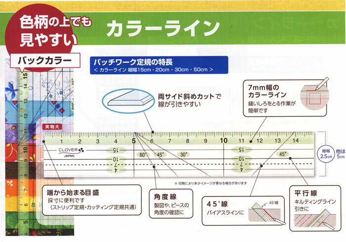 商品特徴 内容本体約30cm厚さ約3mm【色柄の上でも見やすいバックカラーつき】クロバー パッチワーク定規 カラーライン 30cm 背景に色をつけることで、目盛や数字の入っている箇所がひと目で分かり、濃い色の布地や柄物の布地の上でもより見やすくなりました。 また、定規の端の目盛の背景「カラーライン」は、縫いしろ幅にあわせた7mm(ストリップ定規は7.5mm)なので、縫いしろをとる作業も楽にできます。 製図、型紙作り、キルティングライン、印つけなどペンを使っての作業に最適なすっきり見やすい平行線&角度線が入ったシンプルな定規です。 ※画像の関係により現物とは色が異なる場合がございます。※こちらの商品はお取り寄せ商品となりますので、お届けまで4営業日前後かかります。