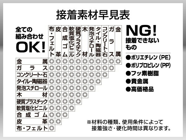 シリル化ウレタン樹脂系無溶剤形 【用途】●金属・硬質プラスチック・木材・コンクリートの強力接着●広範囲の材料に使えます●屋内外・凹凸面・水まわりでの接着と補修●フックや表札・プレートなど壁面への接着●膨張係数の異なる材料同士の接着 【特長】●透明●高機能●耐衝撃●弾力性●超速硬化(初期スピード接着に優れています)●用途広い●無溶剤●耐水性 【接着できないもの】 ポリエチレン・ポリプロピレン・フッソ樹脂・貴金属・高価格品