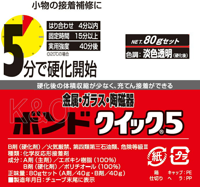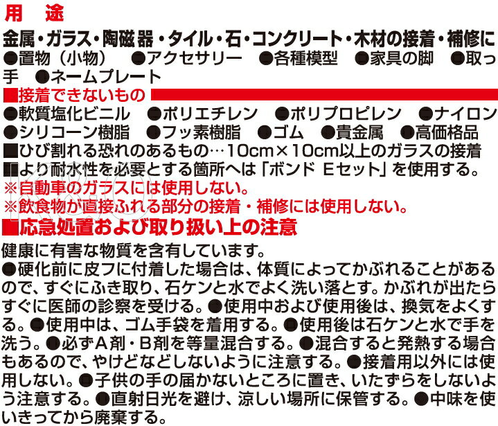 エポキシ樹脂系 【用途】●金属・木・硬質プラスチック・陶磁器のスピード接着と下記材料製品の補修に●アクセサリーや模型の製作・補修●家具・置物の補修●電化製品・日用品の補修●スポーツ・レジャー用品の修理 【特長】●耐久性●耐水性●充てん性●2液混合型●5分硬化開始