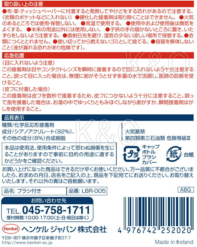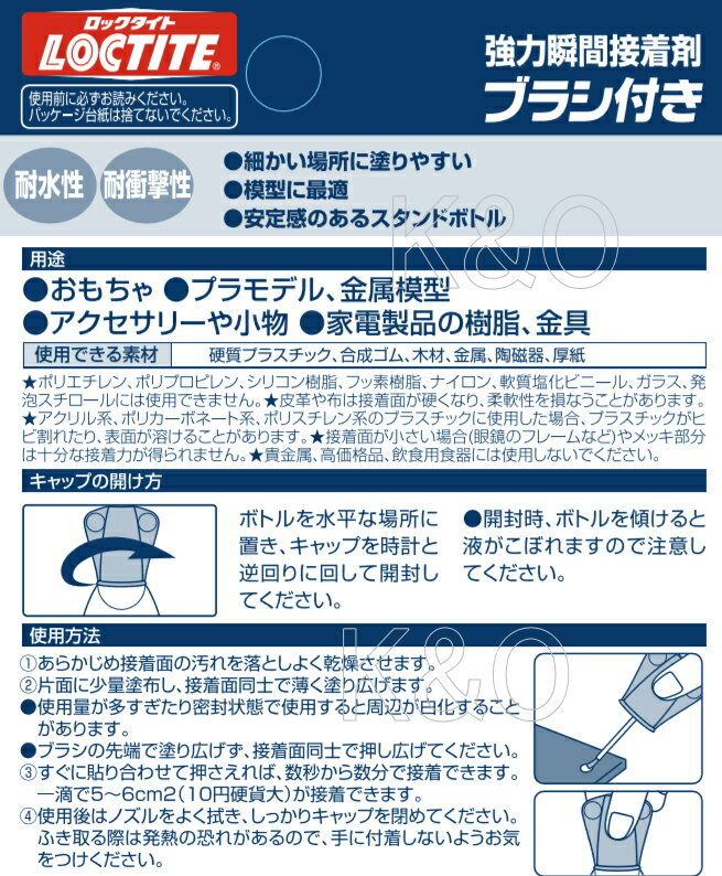 【成分】シアノアクリレート92% 合成樹脂8% 【用途】●おもちゃ・プラモデル・アクセサリー・ペーパークラフト・家電製品の接着補修 ●金属・合成ゴム・硬質プラスチック・陶磁器・木材・厚紙に使用できます。 【特長】 ●細かい場所に塗りやすいブラシ付き ●安定感のあるスタンドボトル ●耐水性 ●耐衝撃 ●衝撃や振動に強く、水にも強い 【注意】●皮革や布は接着面が硬くなり、柔軟性を損なうことがあります。 ●接着面が小さい場所(メガネのフレーム)やメッキ部分は十分な接着強度が得られません。 ●アクリル系・ポリカーボネイト系・ポリスチレン系のプラスチックの場合、プラスチック部分がひび割れたり、表面が溶けることがあります。 ●常時水がかかるところは不可です 【接着できないもの】 ポリエチレン・ポリプロピレン・ナイロン・軟質ビニール・フッ素樹脂・シリコーンゴム・ガラス・発泡スチロールには接着できません。