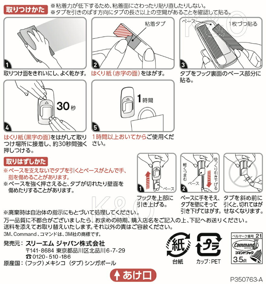 フック本体:スチロール樹脂タブ:ポリエチレン基材、ゴム系粘着剤【耐荷重】3.5kg【サイズ】フック本体:H108×W51×35mm引っかけ部分:W28×太さ7mm【内容】ジャンボフック×1コ・タブL×6枚 ●バッグや上着などをそのまま掛けられる大型フックです。 【取り付けられるところ】●プリント合板(木質新建材)●板壁●柱●家具●机(木・スチール)●ステンレスや冷蔵庫などの金属塗装面●タイル●ガラス●プラスチック●モルタル【取り付けられないところ】●凹凸面●ざらざら面●曲面●壁紙(塩ビ製・布製・紙製)●レンジまわりなどの40℃以上高温になるところ●直射日光のあたるガラス●浴室内や屋外など、雨や水のかかるところ【注意】●時計・カメラ・額など壊れやすいものや貴重品は掛けないで下さい●使用上の注意をお読みの上ご使用ください。