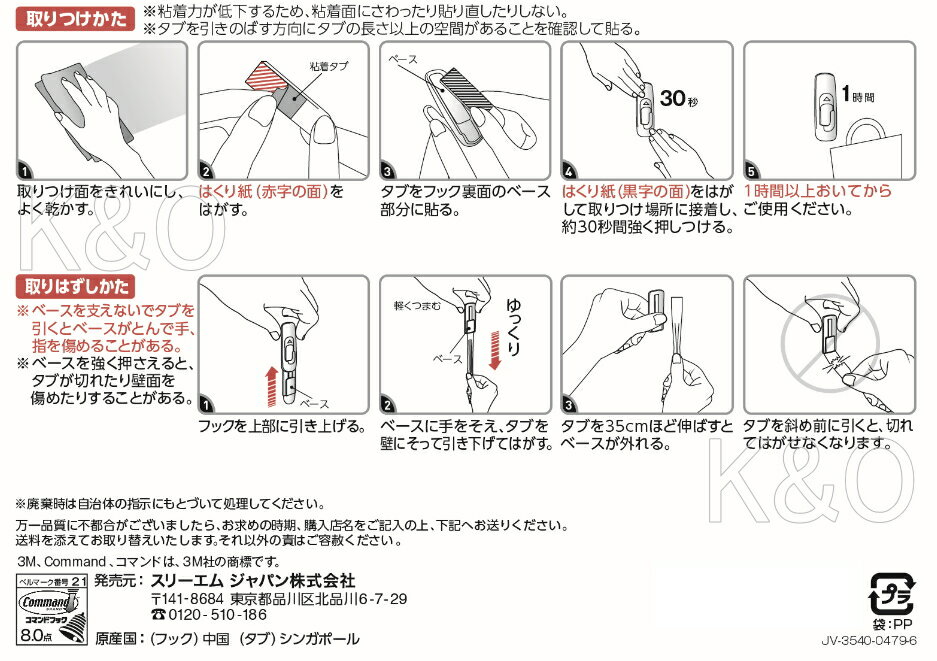 フック本体:ABS樹脂タブ:ポリエチレン基材、ゴム系粘着剤【耐荷重】2.4kg【サイズ】フック本体:H99×W31×35mm引っかけ部分:W12×太さ6.5mm【内容】フックL×6コ・タブL×6枚 ●重いものをしっかり下げたいときに。 【取り付けられるところ】●プリント合板(木質新建材)●板壁●柱●家具●机(木・スチール)●ステンレスや冷蔵庫などの金属塗装面●タイル●ガラス●プラスチック●モルタル【取り付けられないところ】●凹凸面●ざらざら面●曲面●壁紙(塩ビ製・布製・紙製)●レンジまわりなどの40℃以上高温になるところ●直射日光のあたるガラス●浴室内や屋外など、雨や水のかかるところ【注意】●時計・カメラ・額など壊れやすいものや貴重品は掛けないで下さい●使用上の注意をお読みの上ご使用ください。
