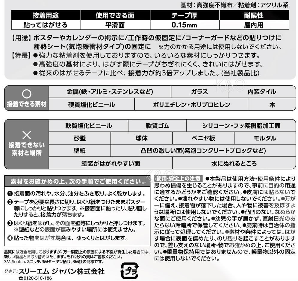 基材:高強度不織布 粘着剤:特殊アクリル系 サイズ 厚0.15mm 幅12mm 長15m 【用途】 ●ポスターやカレンダーの掲示に/工作時の仮固定に ●コーナーガードなどの貼り付けに ●断熱シート(気泡緩衝材タイプ)の固定に 【特長】 ●強力な粘着剤を使用しておりますので、いろいろな素材にしっかりくっつきます。 ●高強度の基材により、はがす際にテープがちぎれにくく、きれいにはがせます。 ●従来のはがせるテープに比べ、接着力が約3倍にアップしました(3M社製品比) 【使用できる素材】 ●金属●ガラス●内容タイル●硬質塩化ビニール●ポリエチレン・ポリプロピレン●木 【接着できないもの】 ●軟質塩化ビニール●シリコーン・フッ素樹脂加工面●砂壁●軟質ゴム●凹凸面●球体●ベニア板●モルタル ●壁紙●凹凸の激しい面●ザラザラした面●浴室など湿気が多い場所●常に浸水している場所●屋外●塗装がはがれやすい面 【注意】 力のかかる用途には使用しないでください。