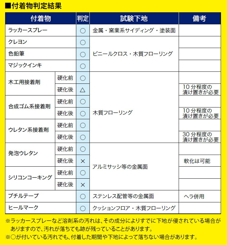 これ1本でプロの洗浄力 【成分】3-メチル3メトキシブタノール、モノテルペノイド混合物、ジヒドロ-2-フラノン 【用途】 ●工具・カッター・はさみについた粘着物に ●マジック・ラッカースプレー・粘着テープ・シール・ラベル・ガム・オイル・グリース・硬化前の発泡ウレタン、コーキング、接着剤・工具の汚れ・油汚れ・その他の汚れ 【特長】 ●プロ仕様の強力な洗浄力で様々な用途にこれ1本でお応えします。 ●天然由来成分を主成分とし、環境にやさしい生分解性です。 芳香族系有機溶剤(シンナー系)は使用しておりません。 ●浸透が早く数秒で汚れを浮かせ、すばやく簡単に作業ができます。 ●下地を傷めにくく、キレイに汚れを落とします。 【注意】 ●あらかじめ使用する素材の目立たないところでテストし、下地に影響が無いか確認してください。 ●土壁、しっくい、紙、壁紙、布、革などしみこみやすい素材や、うるし塗り・ニス塗り面・ワックスがけ面などには使用しないでください。