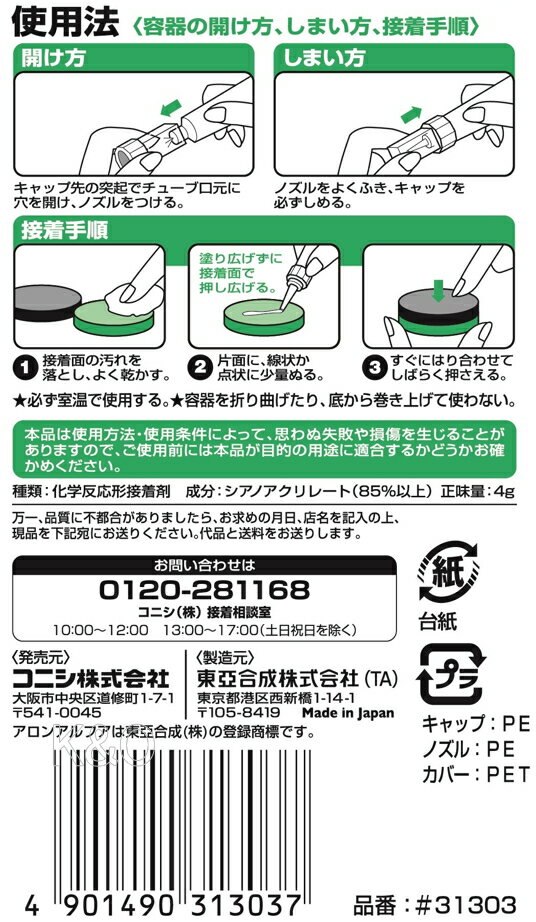 【品番】#31303 【成分】 シアノアクリレート(85%以上) 【用途】 ●木製家具・陶器の置物 ●アクセサリー・小物類 ●プラスチック模型 ●プラスチック・合成ゴム・金属・木材・陶器の接着に 【特長】 ●タレない・しみこまない ●接着時に位置調整しやすい 【接着できないもの】 軟質ビニール・ポリエチレン・ポリプロピレン・シリコーン樹脂・フッ素樹脂・PET樹脂 【強く接着出来ない条件】 ●接着面同士が密着していないとき ●接着する面が小さいとき(メガネフレームなど) ●メッキ面 【ひび割れ、溶けることあり】 ●アクリル・ポリカーボネート・ポリスチレン