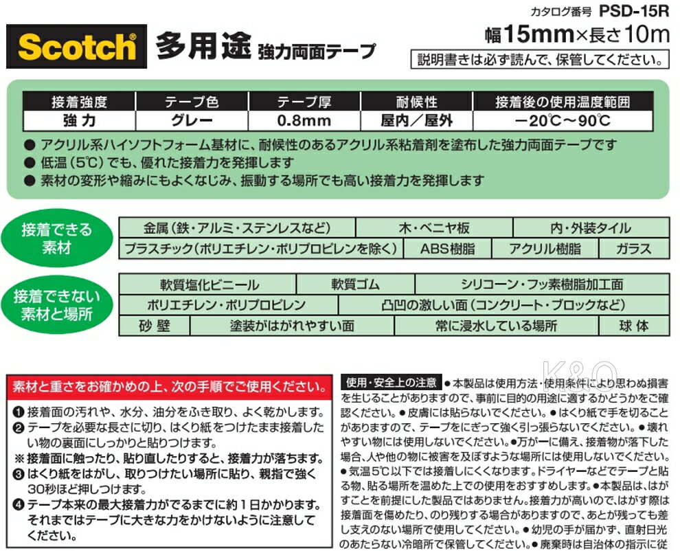 【品番】PSD-15R 【サイズ】幅15mm×長さ10m×厚み0.8mm 【特長】 ●合板やベニヤ板の仮固定、金属の接着などに使用できます。 ●低温(5℃)でも、優れた接着力を発揮します。 ●耐候性に優れたアクリルフォームテープです。 ●テープ色:グレー ●屋内/屋外用 【接着できる素材】 金属(鉄・アルミ・ステンレスなど)、木・ベニア、内/外装タイル、プラスチック(ポリプロピレン・ポリエチレン除く)、ABS樹脂、アクリル樹脂、ガラス 【接着出来ない素材と場所】 軟質塩化ビニール、軟質ゴム、シリコーン・フッ素樹脂加工面、塗装がはがれやすい面、ポリプロピレン、ポリエチレン、砂壁、球体、凸凹の激しい面(コンクリート・ブロックなど)、常に浸水している場所 【接着後の使用温度】 -20℃〜90℃