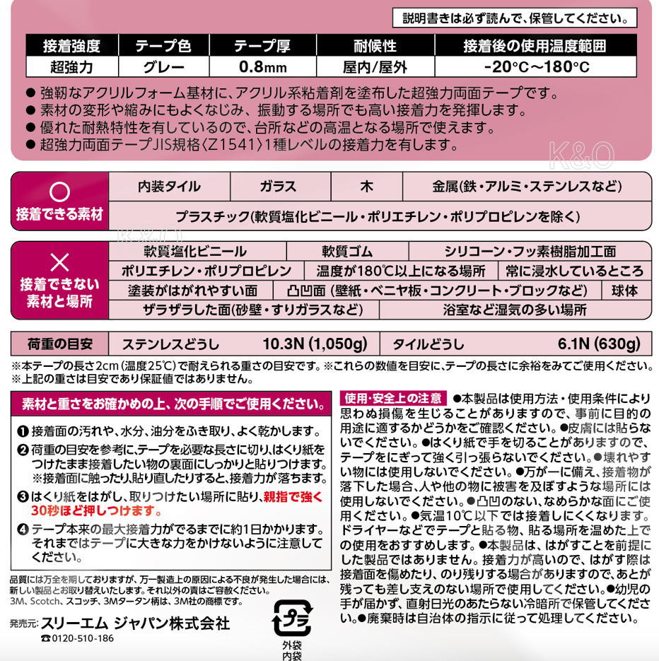 【品番】SHR-19R 【サイズ】幅19mm×長さ4m×厚み0.8mm 【特長】 ●台所など高温となる場所での接着作業に。 ●優れた耐熱特性を有しています。 ●JIS規格<Z1541>1種レベル(構造用接合部)を有しています。 ●テープ色:グレー ●屋内/屋外用 【接着できる素材】 内装タイル、ガラス、木、金属(鉄・アルミ・ステンレス)、プラスチック(軟質塩ビ、PP、PEを除く) 【接着出来ない素材と場所】 軟質塩化ビニール、ポリエチレン、ポリプロピレン、シリコーン・フッ素樹脂加工面、塗装がはがれやすい面、凸凹面(壁紙、ベニヤ板、コンクリート・ブロックなど)、ザラザラした面(砂壁、すりガラスなど)、軟質ゴム、球体、温度が180℃以上になる場所、浴室など湿気の多い場所、常に浸水している場所 【荷重目安】 ステンレスどうし:10.3N(1,050g)タイルどうし:6.1N(630g)※テープ長さ2cmでの目安値。保証値ではありません。 【接着後の使用温度】 -20℃〜180℃