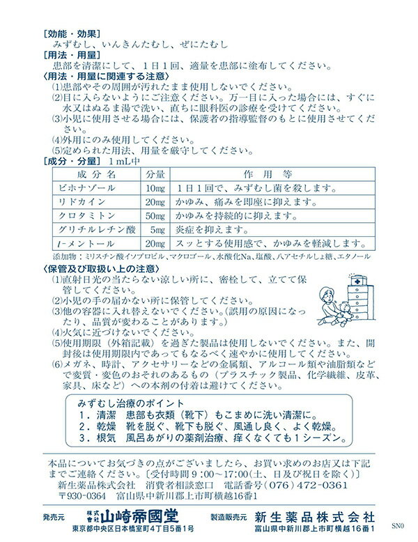 【商品詳細】・ みずむしやたむしは白癬菌というカビの1種が原因となる皮膚病で、一般にたまらないかゆみを伴います。白癬菌は高温多湿を好み、薬剤の浸透しにくい皮膚表面の角質層を棲家とするため退治し難く、再発しやすい疾患です。・ 本剤は、白癬菌などに対して長い時間にわたって殺菌効果を示すビホナゾールを配合しているため、通常1日1回の塗布により効果をあらわし、さらにたまらないかゆみを抑える4つの成分をプラスした、多忙な現代人の清潔にピッタリの、みずむし・たむし治療剤です。・ 指定第2類医薬品【効能効果】・ みずむし、いんきんたむし、ぜにたむし【用法用量】・ 患部を清潔にして、1日1回、適量を患部に塗布してください。【成分】 (1g中)・ ビホナゾール・・・10mg・ リドカイン・・・20mg・ クロタミトン・・・50mg・ グリチルレチン酸・・・5mg・ L-メントール・・・20mg・ 添加物・・・ミリスチン酸イソプロピル、マクロゴール、水酸化Na、塩酸、八アセチルしょ糖、エタノール【注意事項】★用法・用量に関連する注意・ 患部やその周囲が汚れたまま使用しないでください。・ 目に入らないようにご注意ください。万一目に入った場合には、すぐに水又はぬるま湯で洗い、直ちに眼科医の診療を受けてください。・ 小児に使用させる場合には、保護者の指導監督のもとに使用させてください。・ 外用にのみ使用してください。・ 定められた用法・用量を厳守してください。★使用上の注意(してはいけないこと)※守らないと現在の症状が悪化したり、副作用が起こりやすくなります。・ 次の部位には使用しないでください。(1)目や目の周囲、顔面、粘膜(例えば、口腔、鼻腔、膣等)、陰のう、外陰部等(2)湿疹(3)湿潤、ただれ、亀裂や外傷のひどい患部(相談すること)・ 次の人は使用前に医師、薬剤師又は登録販売者にご相談ください。(1)医師の治療を受けている人(2)乳幼児(3)薬などによりアレルギー症状を起こしたことがある人(4)患部が広範囲の人(5)患部が化膿している人(6)「湿疹」か「みずむし、いんきんたむし、ぜにたむし」かがはっきりしない人(陰のうにかゆみ・ただれ等の症状がある場合は、湿疹等他の原因による場合が多い)・ 使用後、次の症状があらわれた場合は副作用の可能性があるので、直ちに使用を中止し、この文書を持って医師、薬剤師又は登録販売者にご相談ください。関係部位・・・皮膚症状・・・発疹・発赤、かゆみ、かぶれ、はれ、刺激感、熱感、ただれ、乾燥感、ヒリヒリ感・ 2週間位使用しても症状がよくならない場合は服用を中止し、この文書を持って医師、薬剤師又は登録販売者にご相談ください。★保管及び取扱い上の注意・ 直射日光の当たらない少ない涼しい所に密栓して保管してください。・ 小児の手の届かない所に保管してください。・ 使用期限(外箱記載)を過ぎた製品は使用しないでください。また、開封後は使用期限内であってもなるべく速やかに使用してください。・ メガネ、時計、アクセサリーなどの金属類、アルコール類や油脂類などで変質・変色のおそれのあるもの(プラスチック製品、化学繊維、皮革、家具、床など)への本剤の付着は避けてください。【お問い合わせ先】こちらの商品につきましての質問や相談につきましては、当店(ドラッグピュア)または下記へお願いします。製造・販売元:株式会社山崎帝國堂 お客様相談係 東京都中央区日本橋室町4丁目5番1号TEL:04-7148-3412 受付時間:9:00〜16:30(土・日、祝日を除く)広告文責:株式会社ドラッグピュア作成:201809KT神戸市北区鈴蘭台北町1丁目1-11-103TEL:0120-093-849製造・販売元:株式会社山崎帝國堂区分:指定第2類医薬品・日本製文責:登録販売者 松田誠司 ■ 関連商品株式会社山崎帝國堂 お取扱い商品水虫薬 関連用品