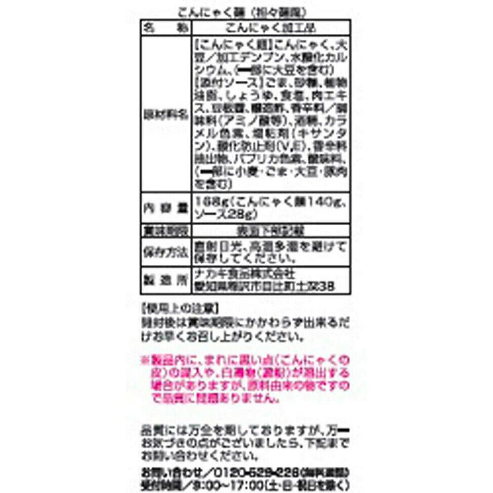 ■製品特徴 ◆200kcal以下の仕様。 平打ちのこんにゃく麺を使用。 封を少し切り、電子レンジ500Wで1分30秒加熱し、和えるだけ。 中華麺やパスタよりもカロリーも糖質も低い。 一食置き換えや、糖質が気になる方に最適。 こんにゃく麺ではあるが水切り不要なので、調理しやすいことも特徴。 ■原材料 こんにゃく麺、こんにゃく、大豆、水酸化カルシウム、ごま、植物油脂、 植物油脂2、しょうゆ、肉エキス、醸造酢、調味料(アミノ酸等)、核酸系調味料、カラメル色素、酸化防止剤(V.E)、水 【お問い合わせ先】 こちらの商品につきましては、当店(ドラッグピュア)または下記へお願い申し上げます。 ナカキ食品株式会社 電話:0587-36-7211 広告文責:株式会社ドラッグピュア 作成:202001SN 神戸市北区鈴蘭台北町1丁目1-11-103 TEL:0120-369-744 製造販売:ナカキ食品株式会社 区分:食品・日本製 ■ 関連商品 ナカキ食品 お取り扱い商品