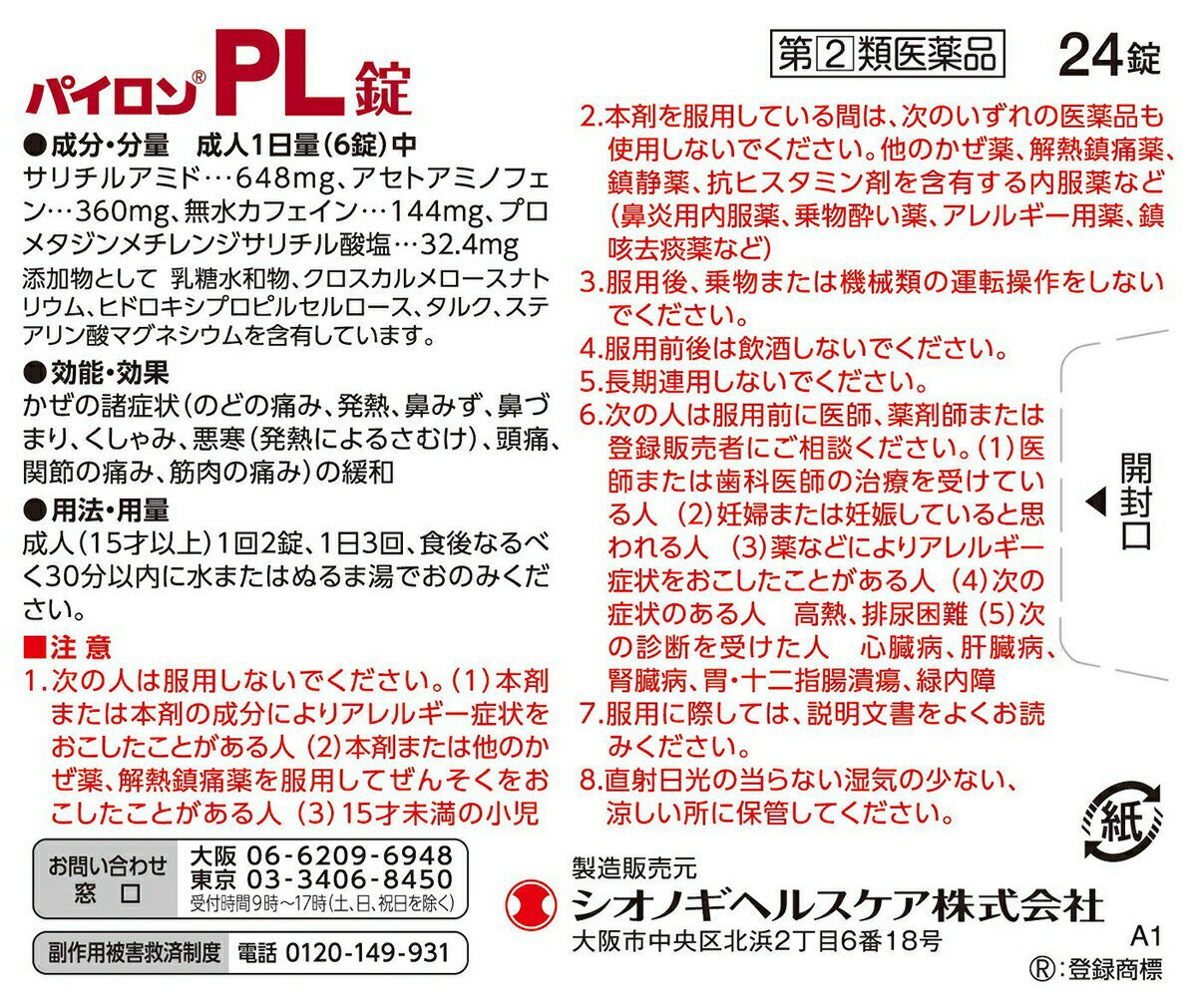 ■製品特徴 パイロンPL錠は、解熱鎮痛成分であるサリチルアミドとアセトアミノフェン、抗ヒスタミン成分であるプロメタジンメチレンジサリチル酸塩、痛みをおさえるはたらきを助ける無水カフェインの4つの有効成分の作用により、「のどの痛み」「発熱」「鼻みず」などのかぜの諸症状にすぐれた効果を発揮する非ピリン系のかぜ薬です ■使用上の注意 ■してはいけないこと■ (守らないと現在の症状が悪化したり、副作用・事故がおこりやすくなります) 1.次の人は服用しないでください (1)本剤または本剤の成分によりアレルギー症状をおこしたことがある人 (2)本剤または他のかぜ薬、解熱鎮痛薬を服用してぜんそくをおこしたことがある人 (3)15才未満の小児 2.本剤を服用している間は、次のいずれの医薬品も使用しないでください 他のかぜ薬、解熱鎮痛薬、鎮静薬、抗ヒスタミン剤を含有する内服薬など(鼻炎用内服薬、乗物酔い薬、アレルギー用薬、鎮咳去痰薬など) 3.服用後、乗物または機械類の運転操作をしないでください(眠気などがあらわれることがあります) 4.服用前後は飲酒しないでください 5.長期連用しないでください ▲相談すること▲ 1.次の人は服用前に医師、薬剤師または登録販売者にご相談ください (1)医師または歯科医師の治療を受けている人 (2)妊婦または妊娠していると思われる人 (3)薬などによりアレルギー症状をおこしたことがある人 (4)次の症状のある人 高熱、排尿困難 (5)次の診断を受けた人 心臓病、肝臓病、腎臓病、胃・十二指腸潰瘍、緑内障 2.服用後、次の症状があらわれた場合は副作用の可能性があるので、直ちに服用を中止し、添付文書を持って医師、薬剤師または登録販売者にご相談ください [関係部位:症状] 皮膚:発疹・発赤、かゆみ 消化器:吐き気・嘔吐、食欲不振 精神神経系:めまい 泌尿器:排尿困難 その他:過度の体温低下 まれに次の重篤な症状がおこることがあります。その場合は直ちに医師の診療を受けてください。 [症状の名称:症状] ショック(アナフィラキシー):服用後すぐに、皮膚のかゆみ、じんましん、声のかすれ、くしゃみ、のどのかゆみ、息苦しさ、動悸、意識の混濁などがあらわれる。 皮膚粘膜眼症候群(スティーブンス・ジョンソン症候群)、中毒性表皮壊死融解症、急性汎発性発疹性膿疱症:高熱、目の充血、目やに、唇のただれ、のどの痛み、皮膚の広範囲の発疹・発赤、赤くなった皮膚上に小さなブツブツ(小膿疱)が出る、全身がだるい、食欲がないなどが持続したり、急激に悪化する。 肝機能障害:発熱、かゆみ、発疹、黄疸(皮膚や白目が黄色くなる)、褐色尿、全身のだるさ、食欲不振などがあらわれる。 腎障害:発熱、発疹、尿量の減少、全身のむくみ、全身のだるさ、関節痛(節々が痛む)、下痢などがあらわれる。 間質性肺炎:階段を上ったり、少し無理をしたりすると息切れがする・息苦しくなる、空せき、発熱などがみられ、これらが急にあらわれたり、持続したりする。 ぜんそく:息をするときゼーゼー、ヒューヒューと鳴る、息苦しいなどがあらわれる。 3.服用後、次の症状があらわれることがあるので、このような症状の持続または増強が見られた場合には、服用を中止し、添付文書を持って医師、薬剤師または登録販売者にご相談ください 口のかわき、眠気 4.5-6回服用しても症状がよくならない場合は服用を中止し、添付文書を持って医師、薬剤師または登録販売者にご相談ください ■効能・効果 かぜの諸症状(のどの痛み、発熱、鼻水、鼻づまり、くしゃみ、悪寒(発熱による寒気)、頭痛、関節の痛み、筋肉の痛み)の緩和 ■用法・用量 次の量を食後なるべく30分以内に、水またはぬるま湯でおのみください。 [年齢:1回量:1日服用回数] 成人(15才以上):2錠:3回 15才未満:服用させないこと 【用法関連注意】 ●定められた用法・用量を厳守してください。 ●錠剤の取り出し方 錠剤の入っているPTPシートの凸部を指先で強く押して裏面のアルミ箔を破り、取り出しておのみください。(誤ってそのまま飲み込んだりすると、食道粘膜に突き刺さるなど思わぬ事故につながることがあります。) ■成分分量 6錠中 サリチルアミド 648mg アセトアミノフェン 360mg 無水カフェイン 144mg プロメタジンメチレンジサリチル酸塩 32.4mg 添加物として 乳糖水和物、クロスカルメロースナトリウム、ヒドロキシプロピルセルロース、タルク、ステアリン酸マグネシウム を含有します。 ■剤型:錠剤 ■保管及び取扱い上の注意 (1)直射日光の当らない湿気の少ない、涼しい所に保管してください。 (2)小児の手の届かない所に保管してください。 (3)PTPシートから出して他の容器に入れ替えないでください。 (誤用の原因になったり、品質が変化します) (4)使用期限をすぎた製品は、服用しないでください。 【お問い合わせ先】 こちらの商品につきましては、当店(ドラッグピュア)または下記へお願いします。 シオノギヘルスケア株式会社「医薬情報センター」 電話:大阪06-6209-694