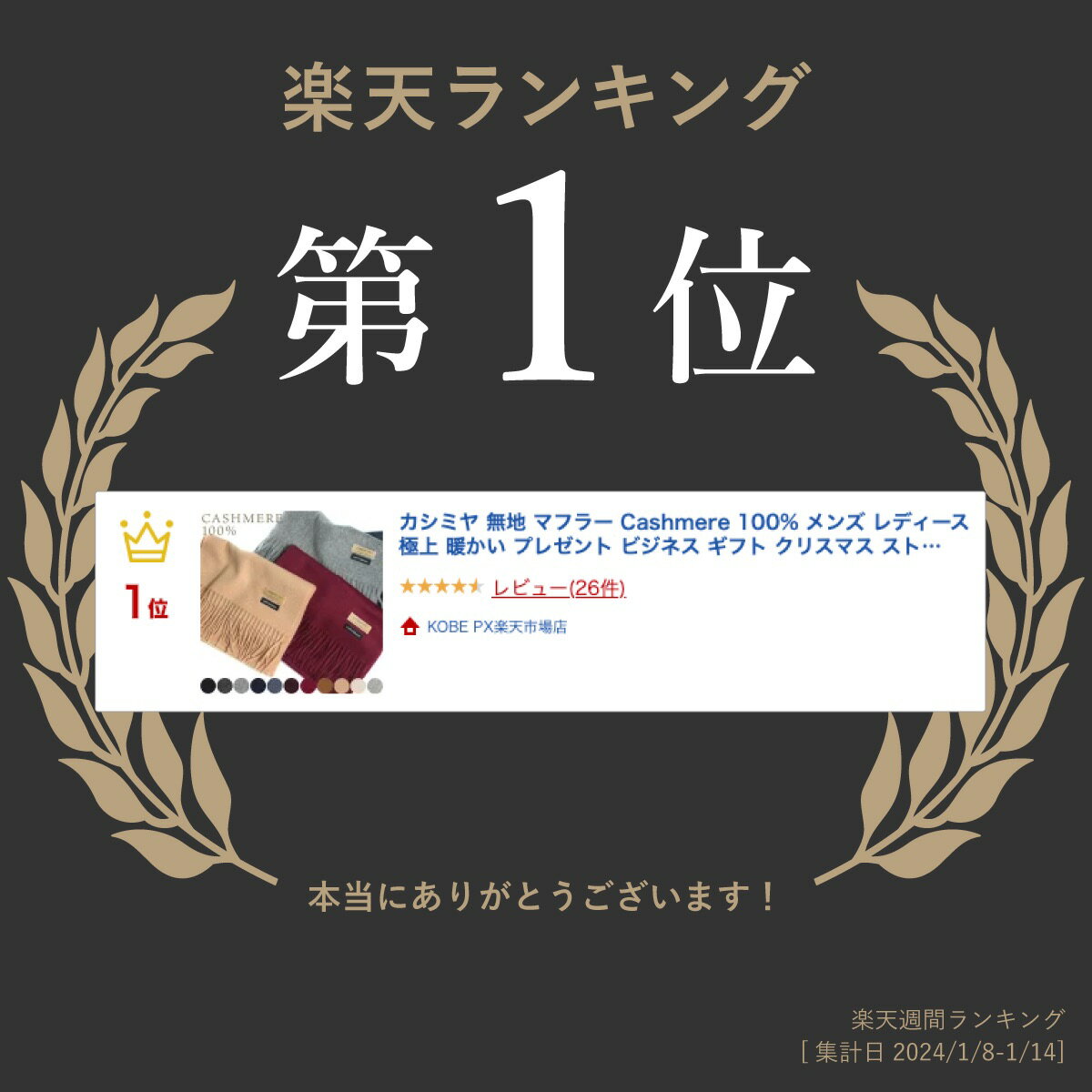 CASHMERE / カシミヤ100%マフラー 繊維の宝石とも呼ばれるカシミヤ100%(中国内モンゴル産)の贅沢なマフラー。 その保湿性や肌触りのよさは、使用すると手放せないほど馴染みが良く、冬を凌ぐアイテムとしては必ず持っておきたい1枚。 ベーシックで老若男女問わずお使い頂ける無地のシンプルな仕様です。 もちろん大切な人への贈り物としても喜ばれます。 クリスマス、バレンタイン、父の日、敬老の日、お誕生日、成人のお祝い、様々な記念日の贈り物にいかがでしょうか。 ★運送方法・運送会社はお住まいの地域やご購入の商品により異なります。 お客様ではお選びいただくことが出来ませんので、あらかじめご了承ください。 ★製造年により、商品仕様・価格が異なります。あらかじめご了承ください。 ★単品でのご購入の場合、発送方法はネコポスのため、配達日指定は承っておりません。