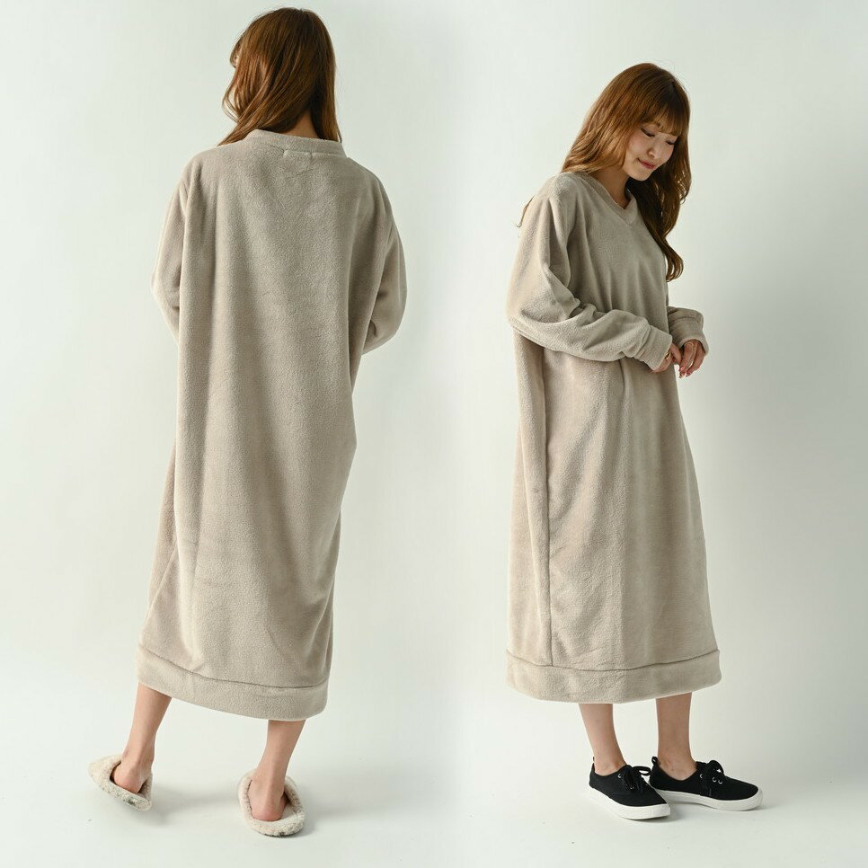 送料無料 もこもこVネックワンピース マキシ丈 ロング丈 長袖 レディース ルームウェア 部屋着 あったか ゆったり ふわもこ ふわふわ シンプル 無地 カジュアル 冬 女性