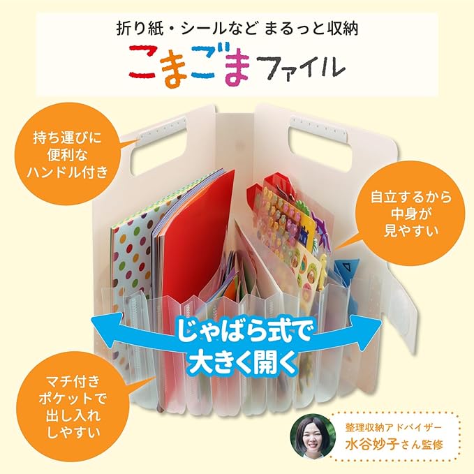 商品情報商品説明・折り紙やシールなどの細かな文房具類を整理・収納できるポケットファイル・じゃばら式の幅広サイズポケットで出し入れしやすい・自立するので中身が一覧できて選びやすい・面ファスナーで開け閉め簡単・ハンドル付きで簡単に持ち運びできる・別売りのおかたづけボックスに収納可能・整理収納アドバイザーの水谷妙子氏監修商品本体サイズ210mm×175mm×35mm、92g素材本体:ポリプロピレン台紙:紙袋:ポリプロピレン注意事項※重すぎるものを入れたり、収納物を入れすぎたりしないでください。耐荷重:400g(目安)※高温多湿の環境、直射日光が当たる場所に置かないでください。注意事項モニターの発色具合によって実際の物と色合いが異なる場合がございます。