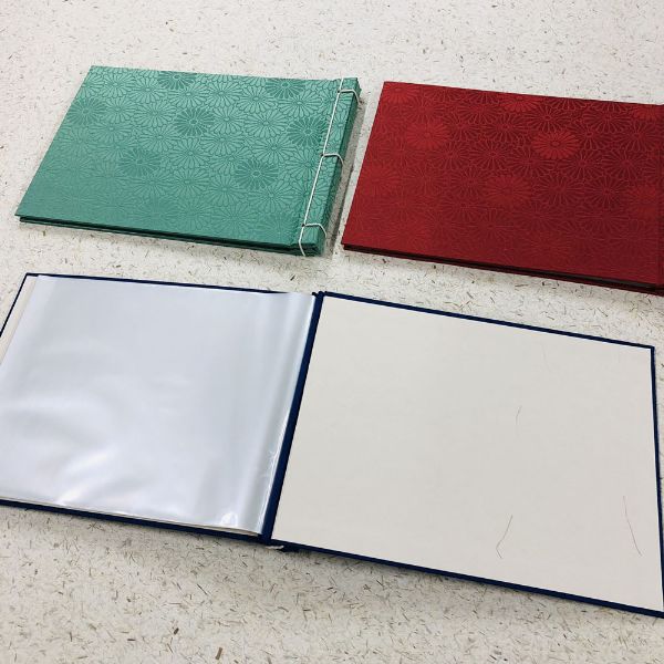 ※動画内にある西陣織の商品は完売終了しておりますが、仕様が似ているため参考に掲載しております。現在の仕様とは一部変更もありますので、以下の最新の仕様を必ずご確認ください。(変更箇所:OPPが30枚から25枚に変更など) 書き置き専用御朱印帳(トップインタイプ) ※実用新案登録済 サイズ:約20.5cm x 29cm x 1cm 内寸:大判2枚分(横24x縦18センチ)の書き置きを入れる事が可能なゆったりとした寸法になっています。 本身:破れにくい素材を採用、ビニールOPP25枚(両面使用で最大50枚収納可) 表紙カラー:布クロス、百裂小菊5色展開(紺、赤、緑、山吹、橙) 付属品:御朱印・御首題ラベル 生産国:日本(高知県)和綴じ製本 ばっちり大き目!見開きサイズ 幅12センチの大判御朱印が2枚分しっかり入る大きさを確保しました。当社の蛇腹式ポケットタイプよりも、一回り大きく作ってみたので、ほぼすべての書き置きサイズを納める事が可能と言えるような仕上がりとなっております。写真は縦18センチ、横24センチの紙を実際に入れてみた参考写真になります。 材質変更で破れにくく! クリアなOPPが25枚綴じられており、たっぷり両面使って50枚の書き置きを収納する事が可能となっております。また、今回よりOPの材質を変更し、熱圧着部分も含めて破れにくい素材と工法で仕上げた中身へと変更することにより、中身が非常に破れにくくなりました。力強く引っ張っても、破れずにゴムのように伸びる素材工法となっております。 喉部分の厚みを調整し、御朱印帳の収まりを解消 アルバムのようにスクラップしていく書き置き御朱印帳。どうしても御朱印がたまっていくと、ほんの小口部分がどんどんどんどんと膨らんでいきます。今回は独自アイデア(※実用新案登録)で、御朱印帳の喉部分に枕を敷く事により、小口のふくらみが増してきても、本としての装丁を保ちやすいように十分に喉の厚みを調整しております。