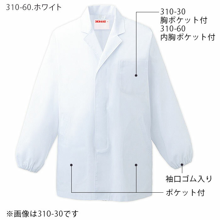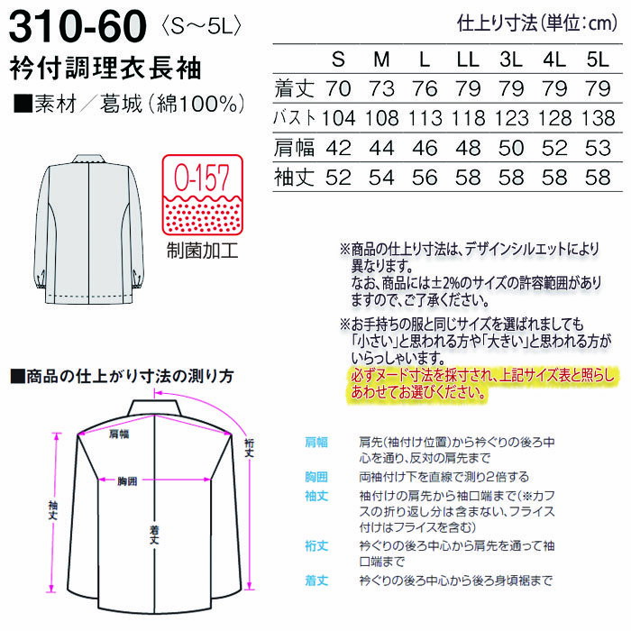 【PT10倍&最大600円クーポン 11/27 2時迄】 衿付調理衣 310-60 メンズ 男性用 長袖 綿100% S〜5L ホワイト 白 和食 飲食店 ユニフォーム 制服 調理 白衣 厨房 KAZEN カゼン