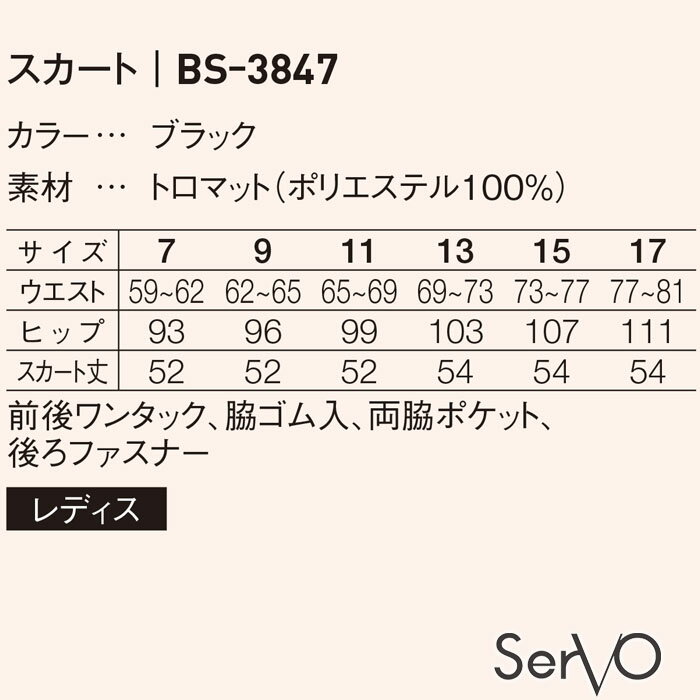 脇ゴム入りスカート BS3847 7号〜17号 ブラック レディース 女性用 脇ゴム入 飲食店 カフェ 接客 制服 ユニフォーム スカート SerVo サーヴォ