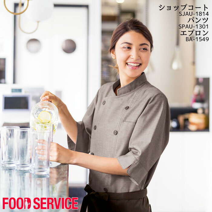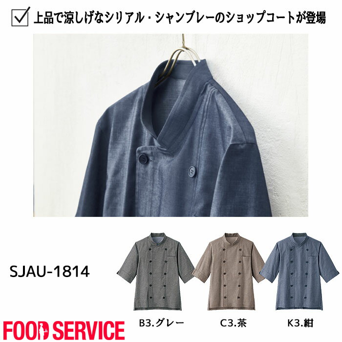男女兼用 ショップコート コックコート SJAU1814 グレー 茶 ブラウン 紺 ネイビー シャンブレー 飲食店 カフェ おしゃれ 制服 ユニフォーム SerVo サーヴォ