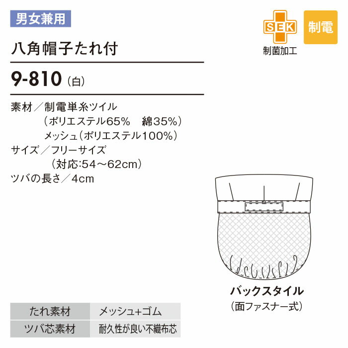 【PT2倍&最大600円クーポン 11/27 2時迄】 [レビュー特典対象] 八角帽子たれ付き 食品工場 食品衛生帽子 9-810 男女兼用 メンズ レディース 常温作業 フードファクトリー 衛生キャップ フード帽子 制菌 軽作業 綿混 制服 ユニフォーム 住商モンブラン