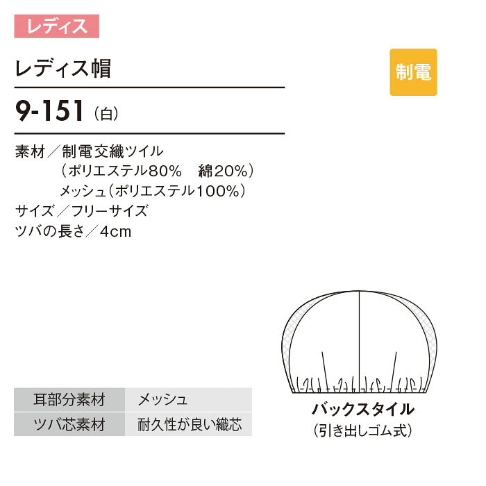 [レビュー特典対象] レディス帽 9-151 女性用 レディース 常温作業 耳メッシュ 制菌 食品工場 食品衛生帽子 衛生キャップ フード帽子 軽作業 厨房 給食 たれ無し 制服 ユニフォーム 住商モンブラン